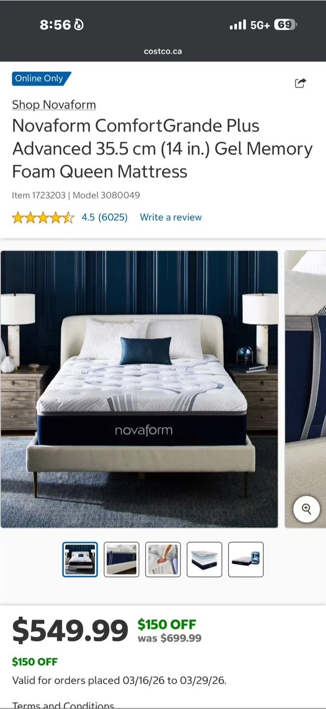 Novaform ComfortGrande Plus Advanced queen mattress. 35.5 cm (14 in.) thickness. Features gel memory foam. It's designed for comfort and support.