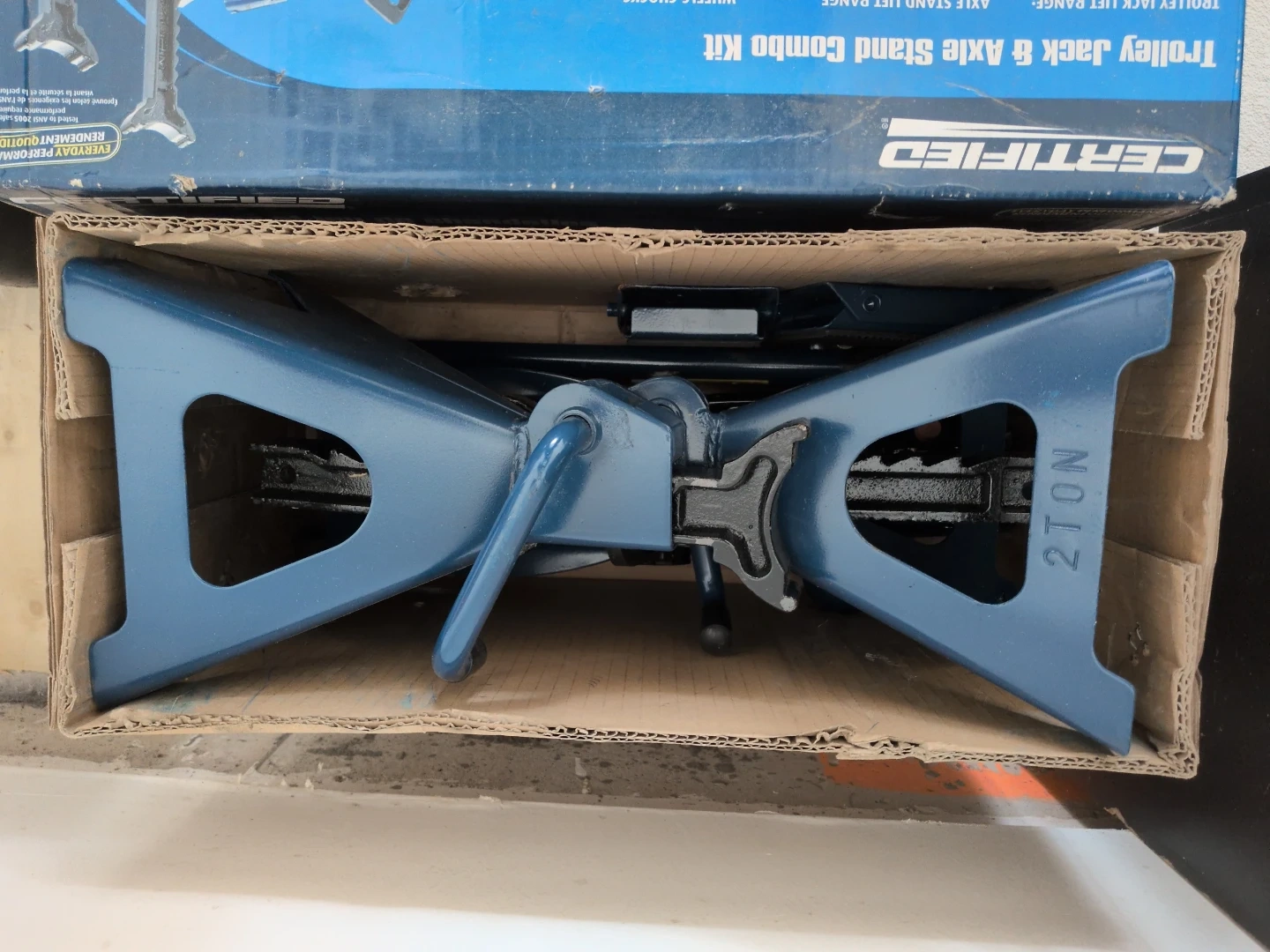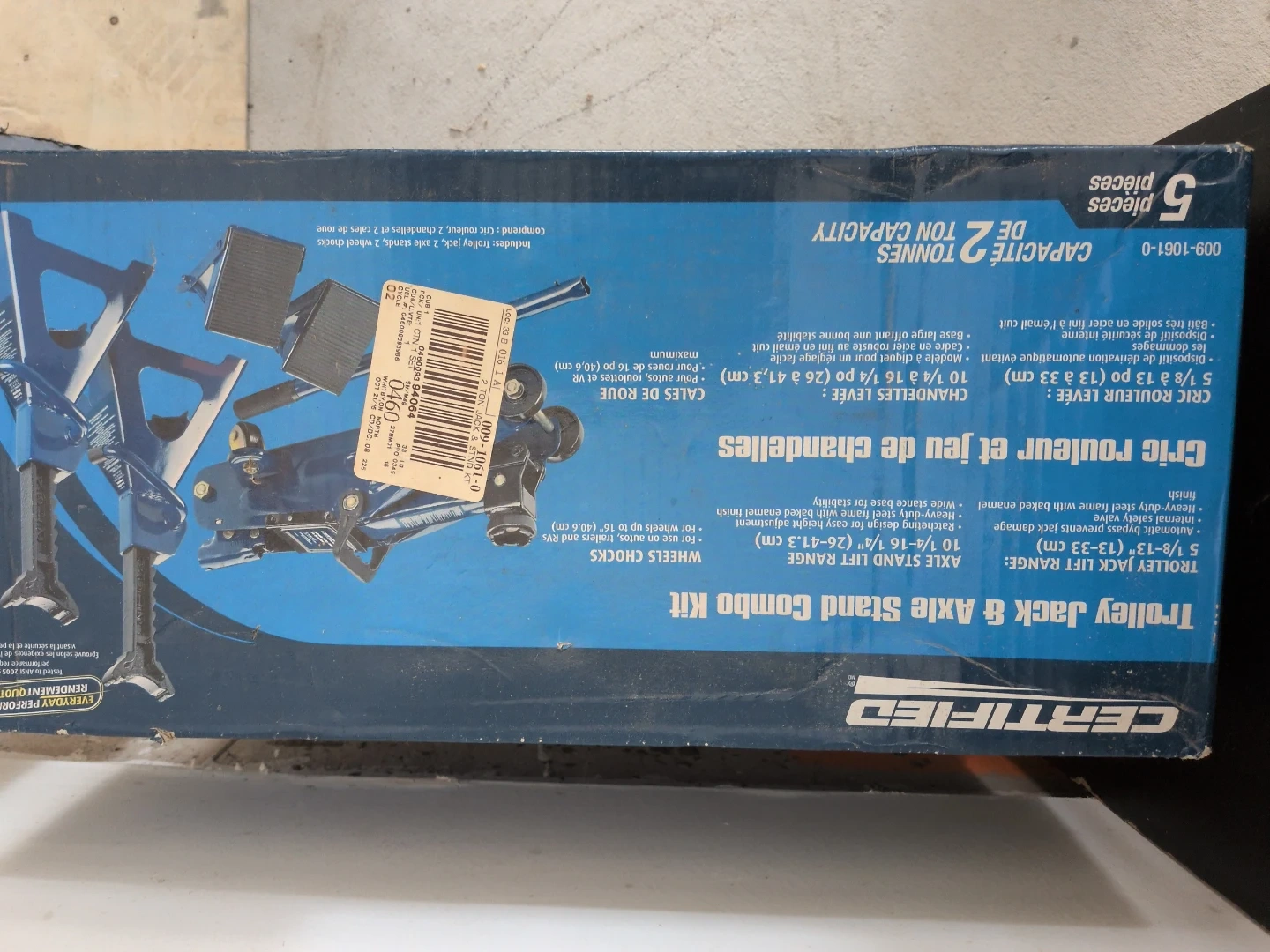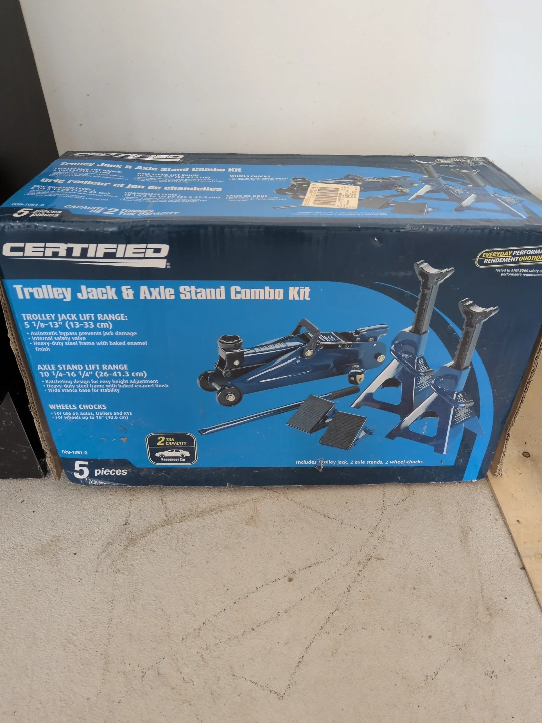 This Certified trolley jack and axle stand combo kit comes with 5 pieces. It includes a trolley jack with a 5 1/8"-13" (13-33 cm) lift range and axle stands for easy height adjustment. Wheel chocks are also included for added safety. The jack has a 2-ton capacity.