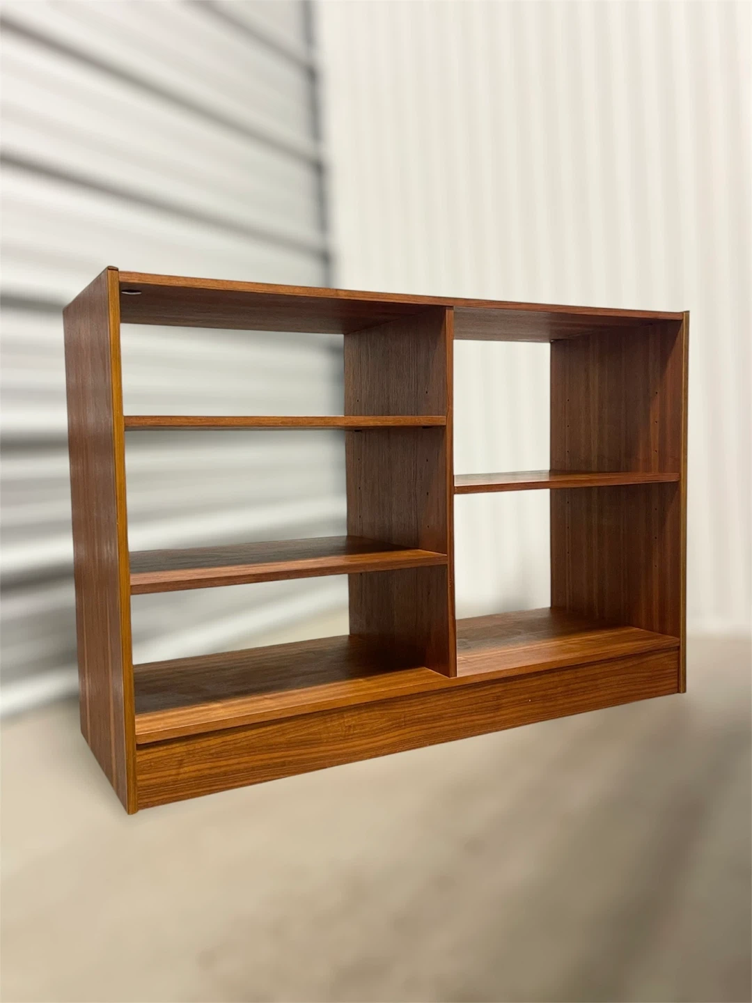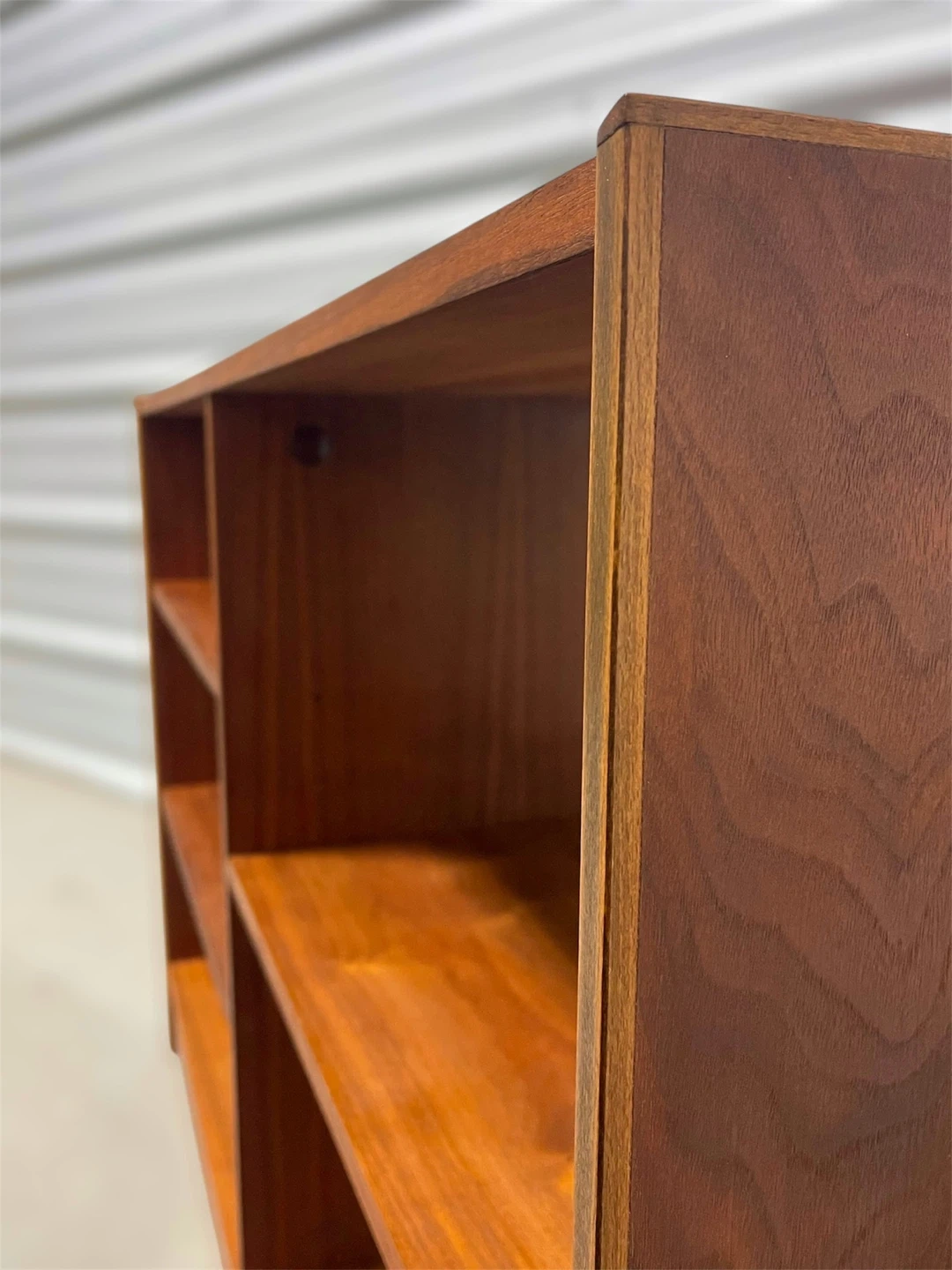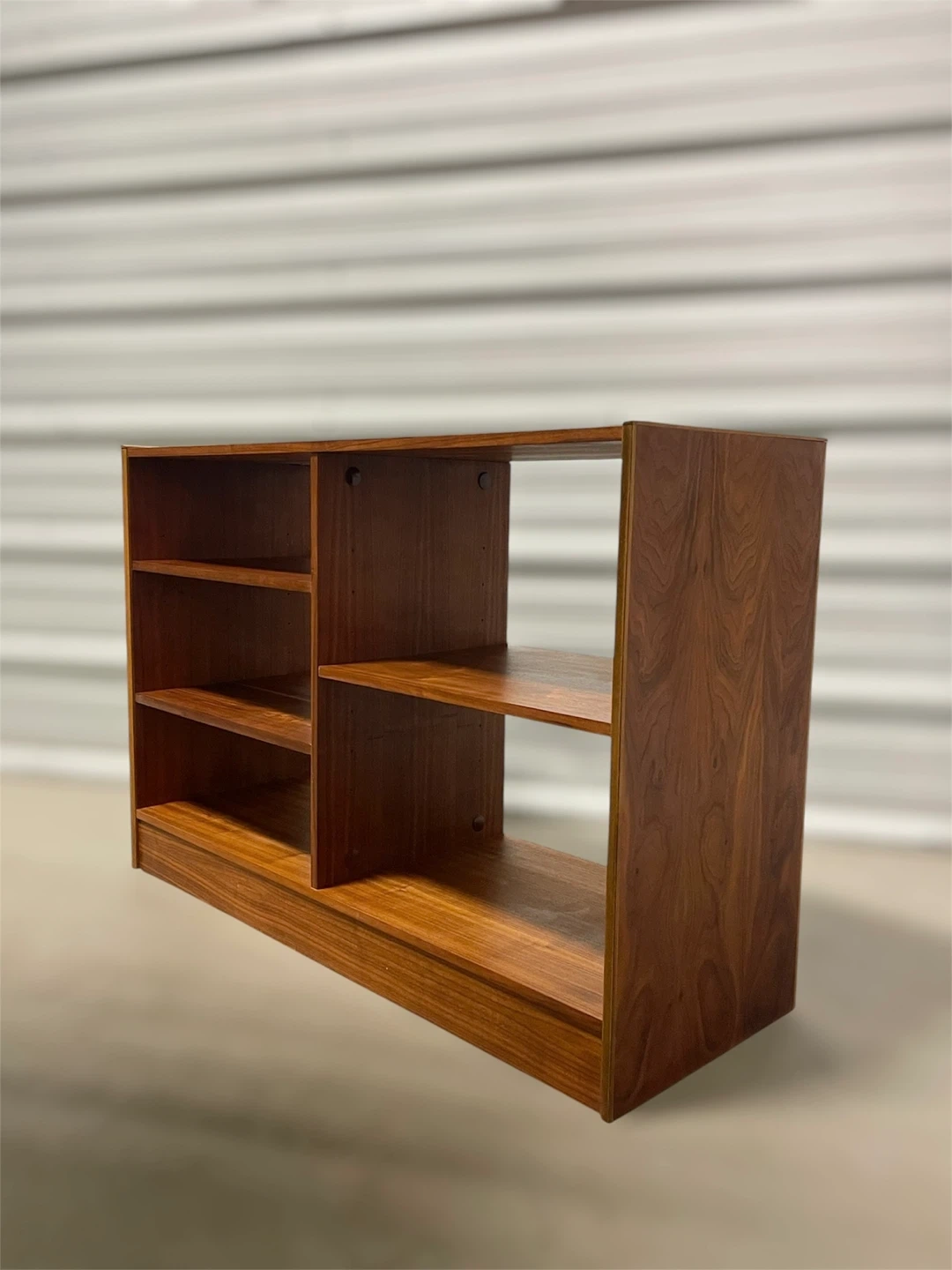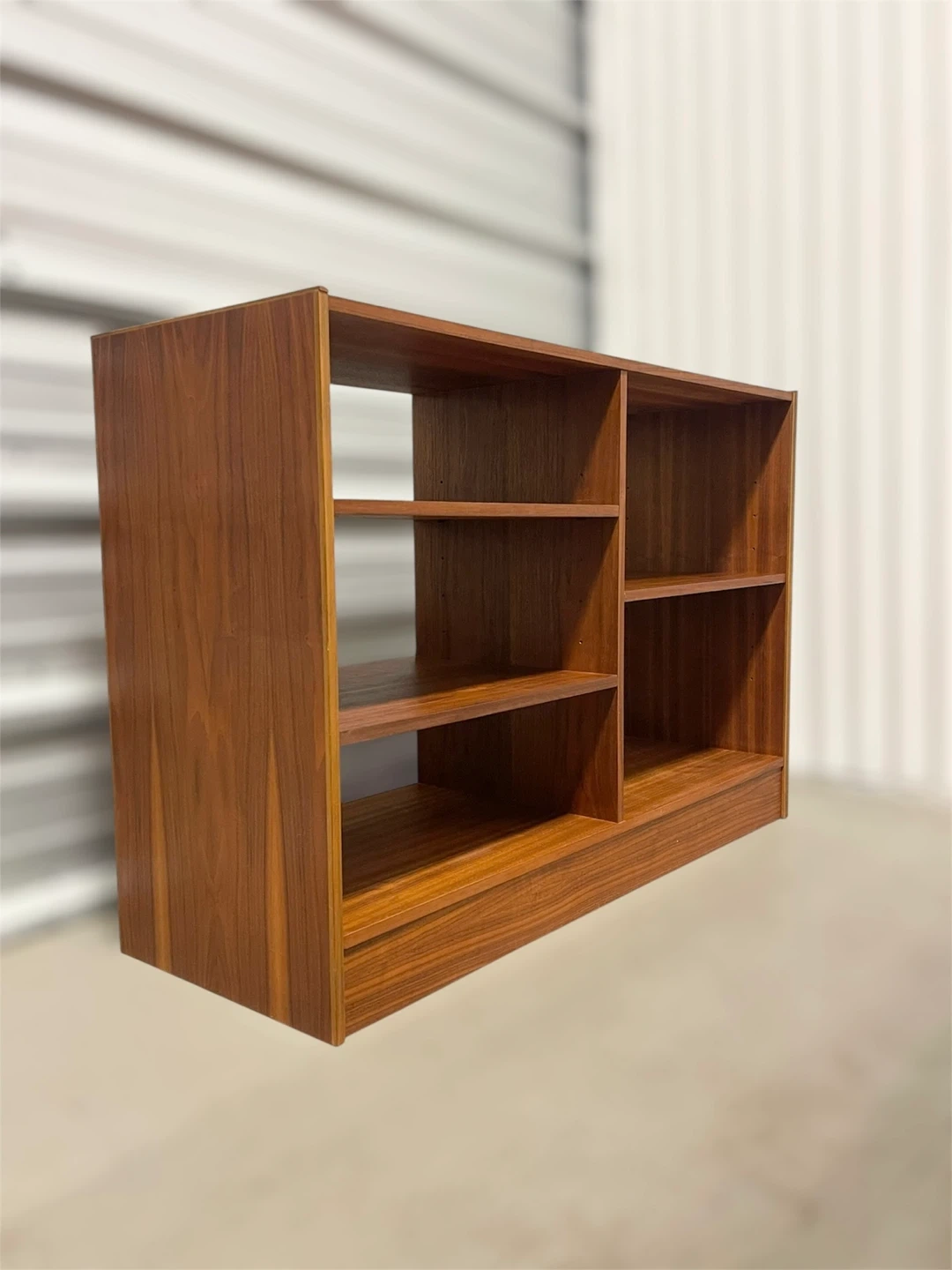 Mid-century modern modular open walnut bookcase or sideboard designed during the 1960s featuring three adjustable shelves. Excellent condition.