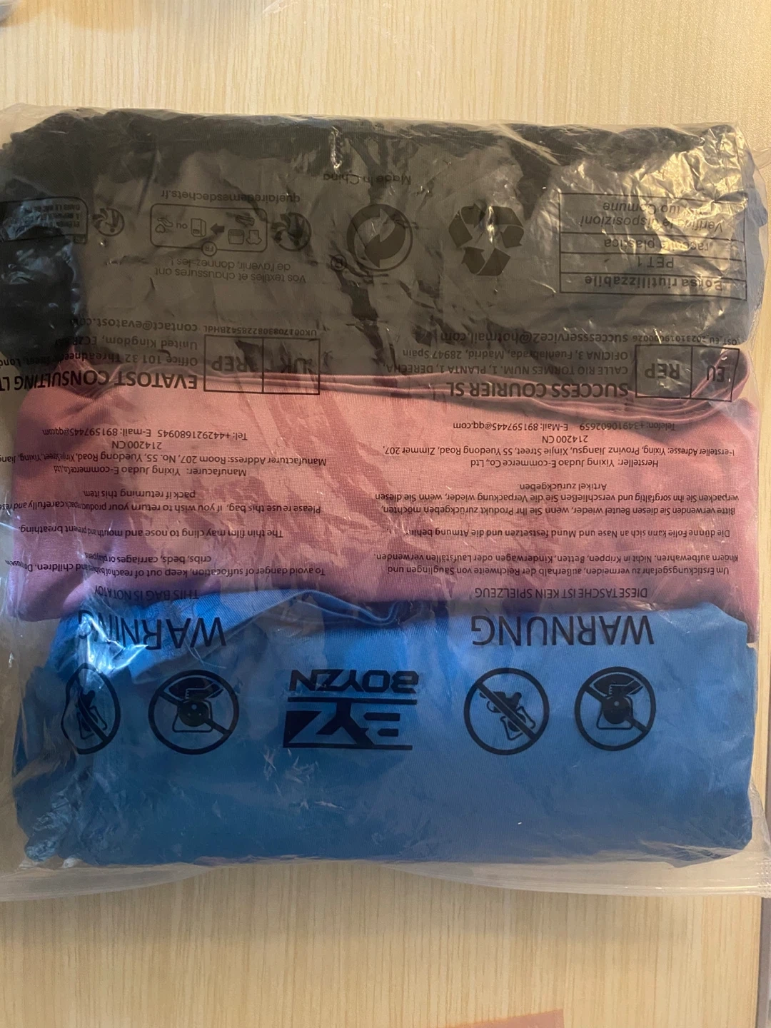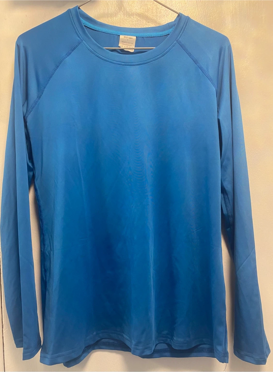 This is a pack of three Boyzn long sleeve athletic shirts. They are made of 85% polyester and 15% spandex. Includes one blue, one pink, and one black shirt. Each shirt is size small.