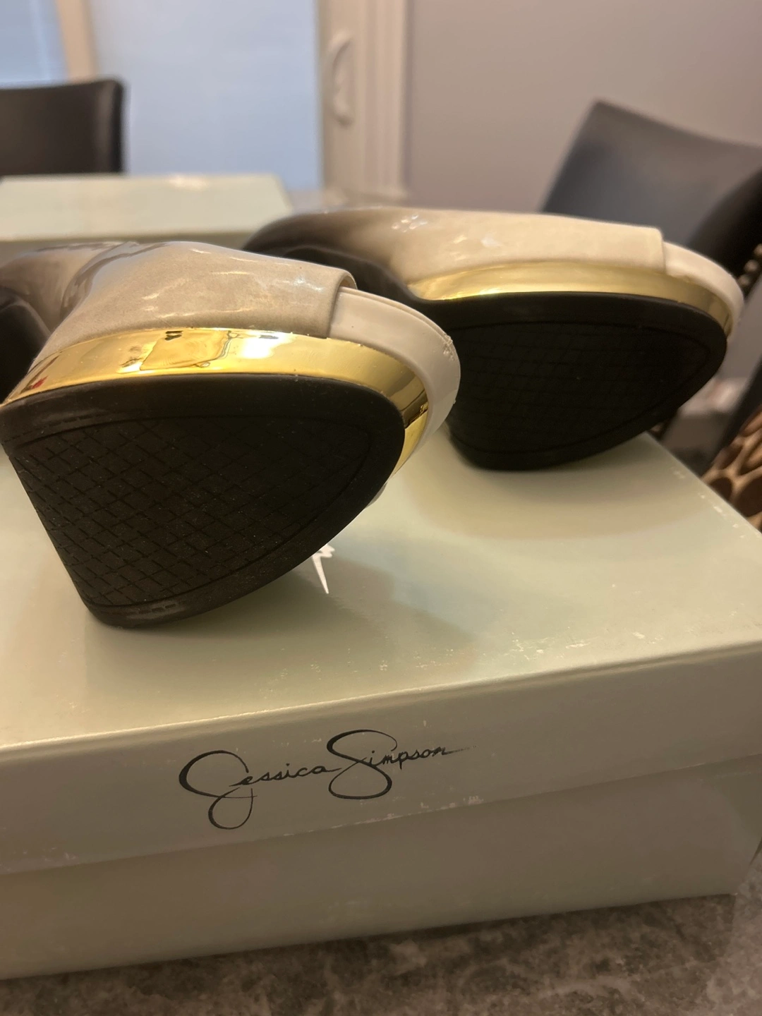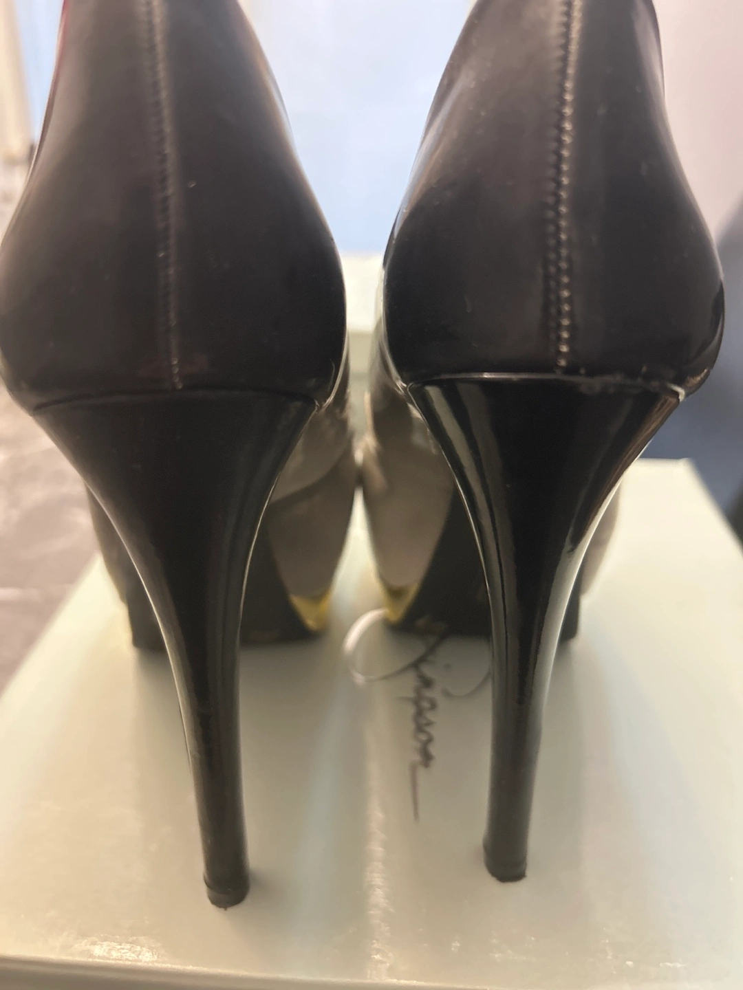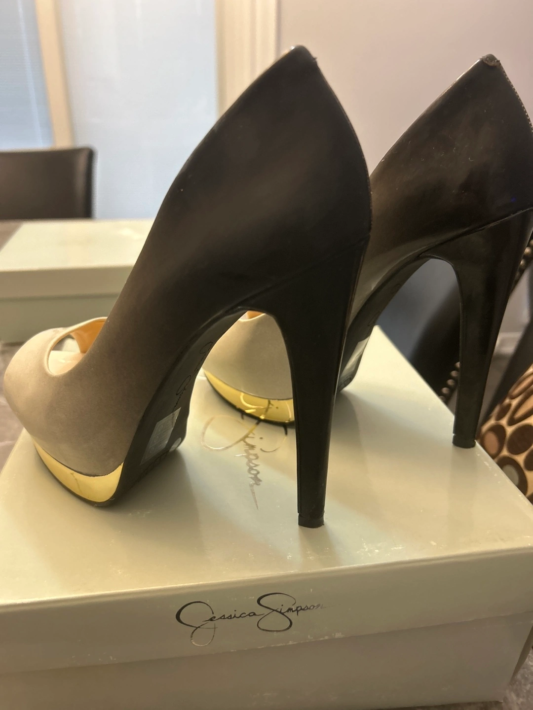 Stylish ombre peep-toe platform heels. Black and grey suede-like material. Gold platform and heel detail. High heels. In original box.