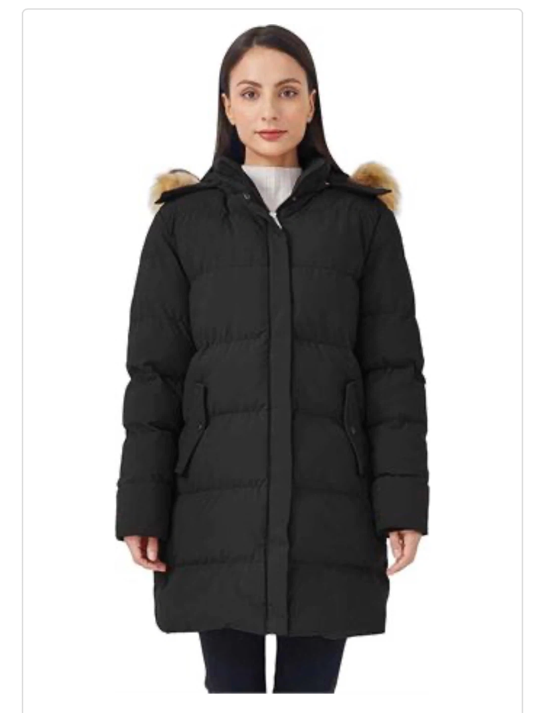 Stay warm and stylish in this black puffer coat. It features a cozy hood with faux fur trim. The mid-length design offers great coverage for chilly days. It's perfect for everyday wear during the colder months!