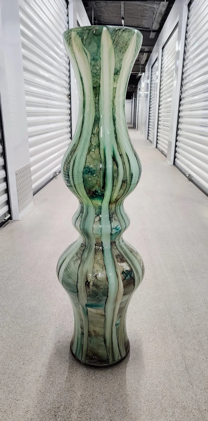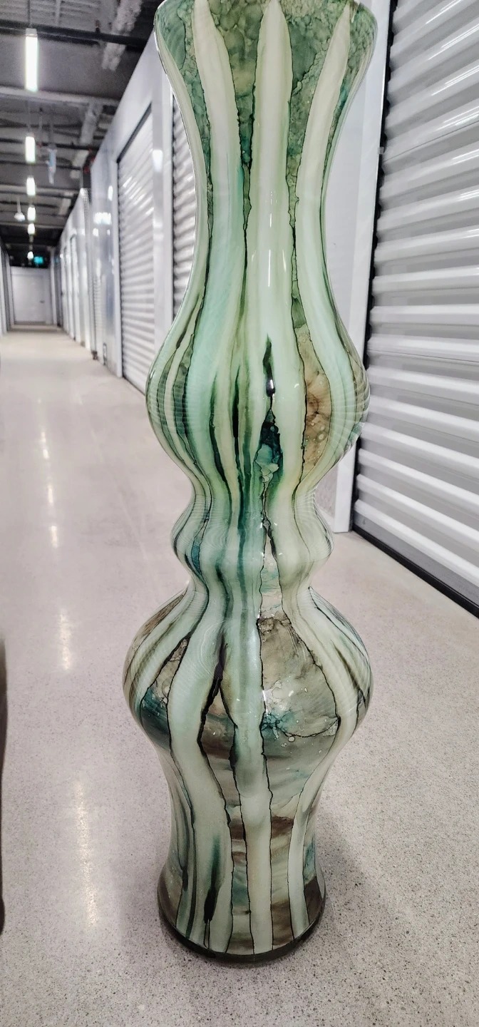 A tall glass vase featuring a distinctive green and white swirl pattern. It has a unique hourglass shape with ribbed detailing. This decorative piece can add a touch of artistry to any room.