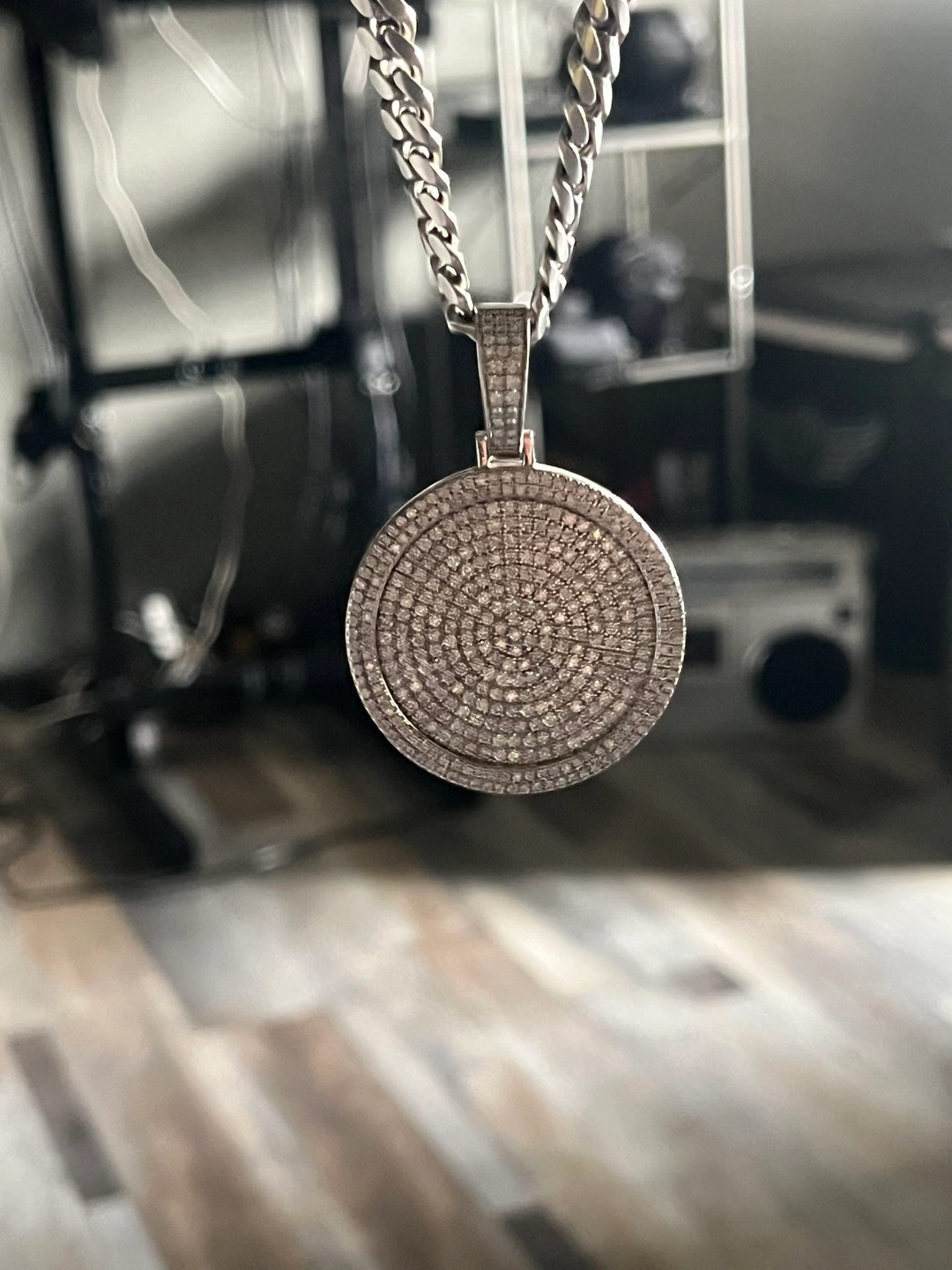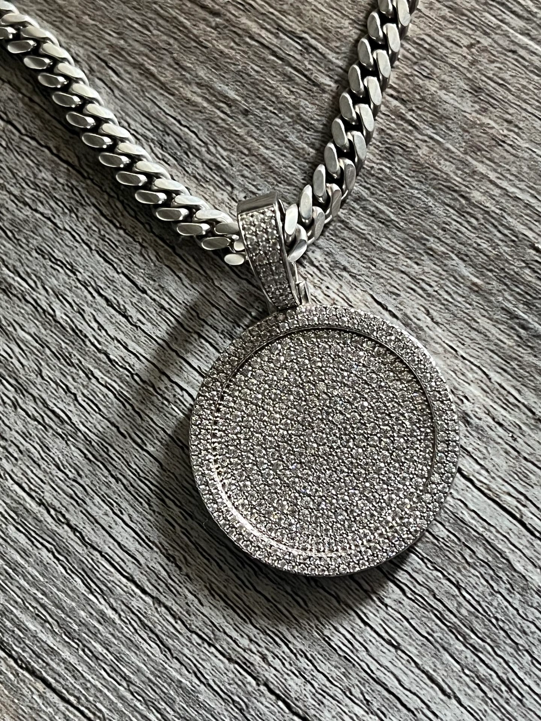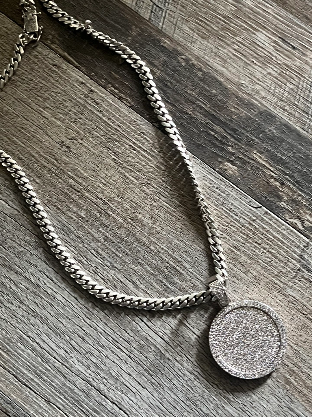 20 inch silver chain, real 925 silver. Features moissanite diamonds on the lock and a medallion with moissanite diamonds (3K).