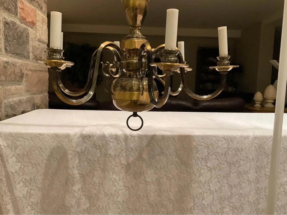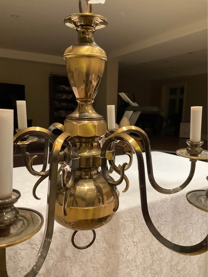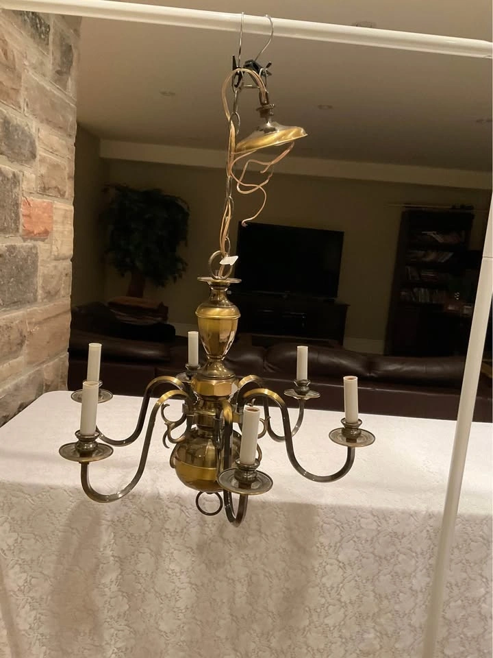 Stunning vintage Mid Century brass traditional chandelier made in Spain by Pradas. Excellent condition! Very heavy solid brass piece. Light arm to light arm circumference is 23 1/2 inches. Chain is 16 inches. Top of fixture to bottom is 18 1/2 inches (not including chain). Bottom circumference is 17 inches. From a smoke & pet free home. Cash only in Richmond Hill (Bathurst & King Rd).
