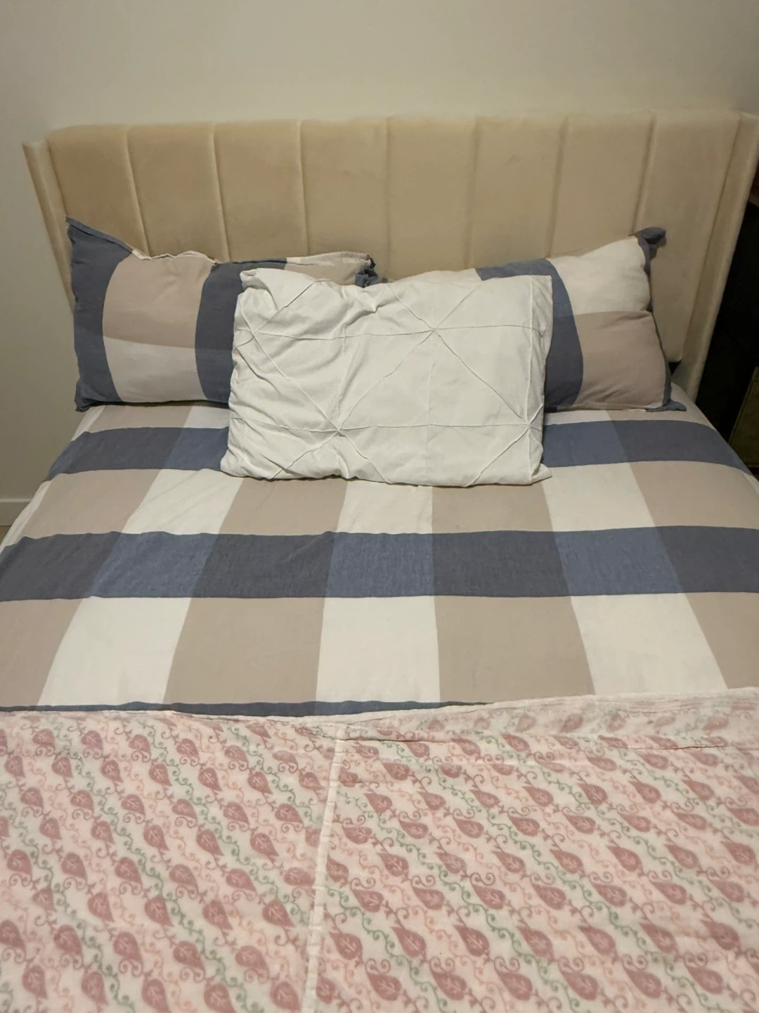 Sturdy bed frame with classy cream coloured velvety headboard. The mattress is 9 inch thick spring mattress. It is a double bed. I bought it 2 months ago but unfortunately I will be moving to Edmonton by the end of February so now it has to go. The pillows are free with the bed frame and the mattress. I can also add a 100% pure cotton fitted sheet for free as well.