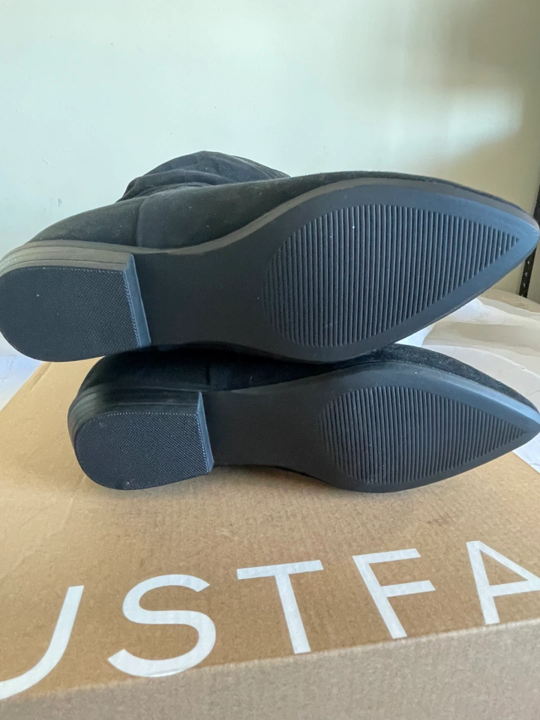 These are black suede flat boots from JustFab. They're a size 6 and have a ruched shaft design. Comes with the original box. They have never been worn.