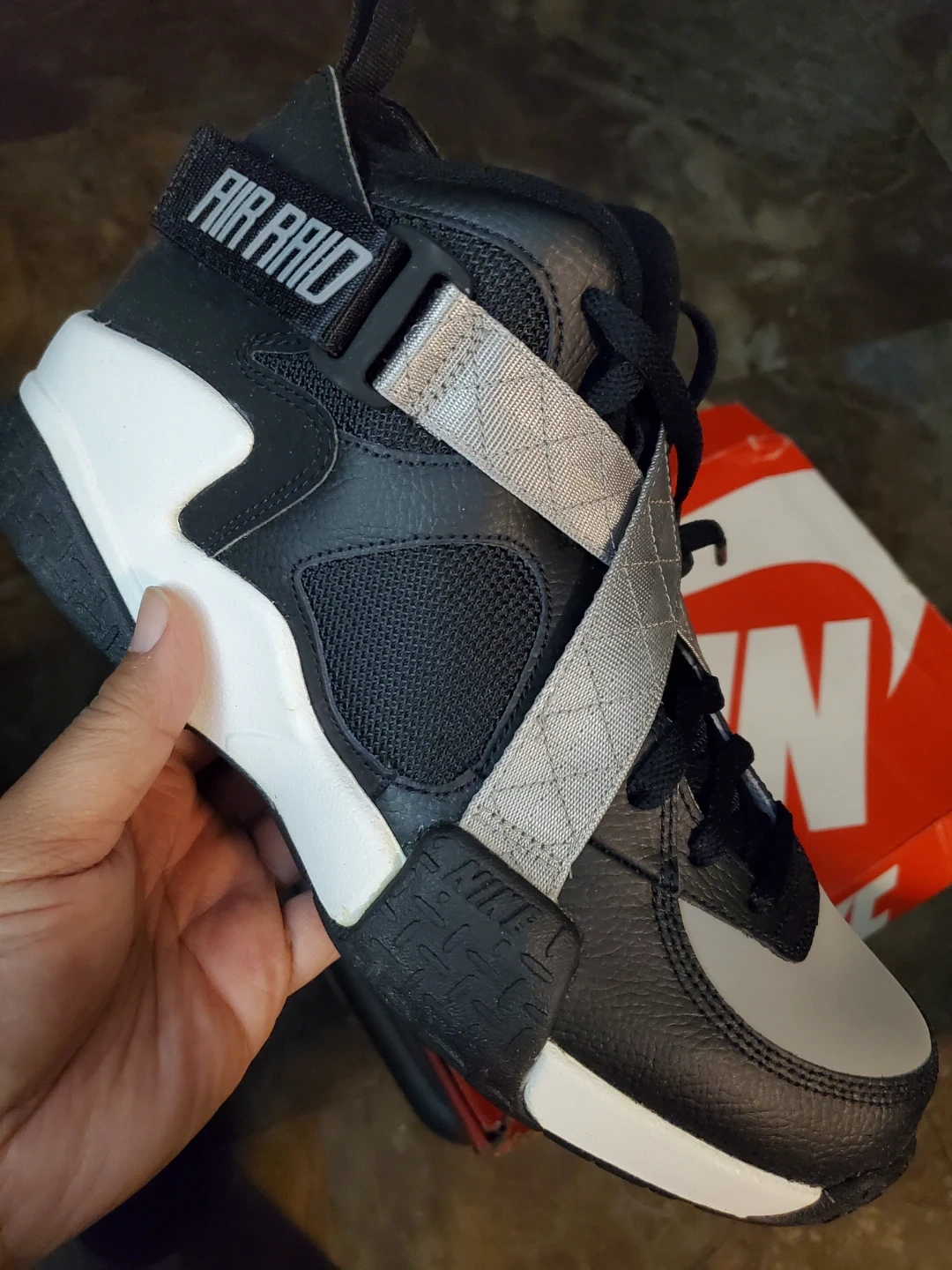 Nike Air Raid shoes in black and white. Features the iconic cross-strap design for a secure fit. Rubber sole for traction. Includes original box.