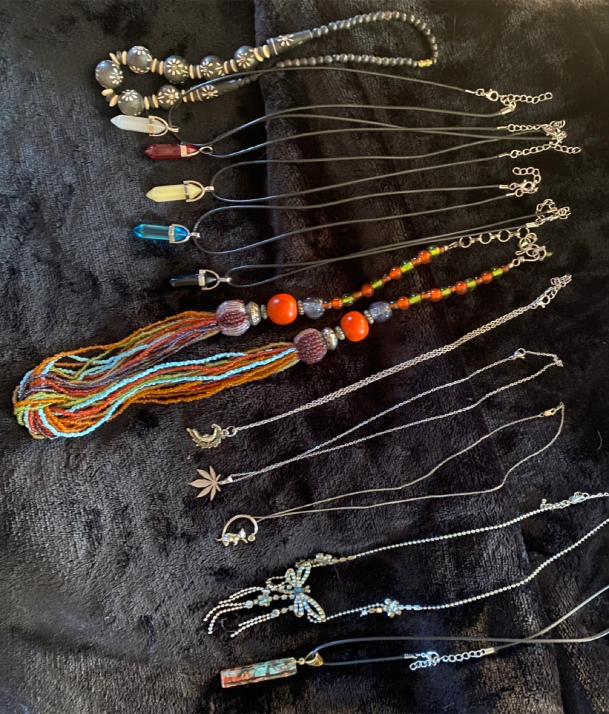 Selling a bundle of assorted necklaces! There's a variety of styles, including beaded necklaces, silver chains with pendants, and crystal pendants on cords. Perfect for adding some variety to your jewelry collection!