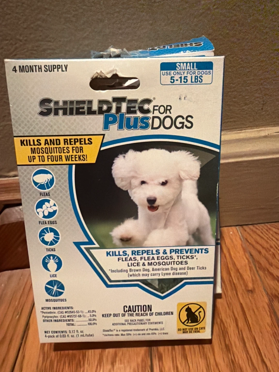This is a 4-month supply of ShieldTec Plus for Dogs, designed for small dogs weighing 5-15 lbs. It kills, repels, and prevents fleas, flea eggs, ticks, lice, and mosquitoes. Each pack contains four 0.03 fl. oz. tubes.