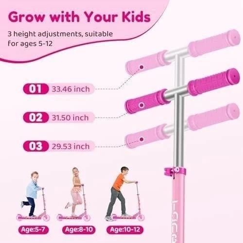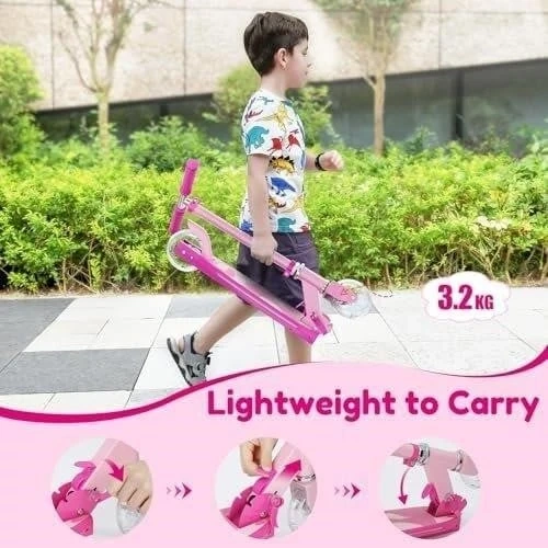 This pink scooter is lightweight and easy to carry at only 3.2 kg. It offers 3 height adjustments, suitable for kids aged 5-12. It's designed to grow with your kids!
