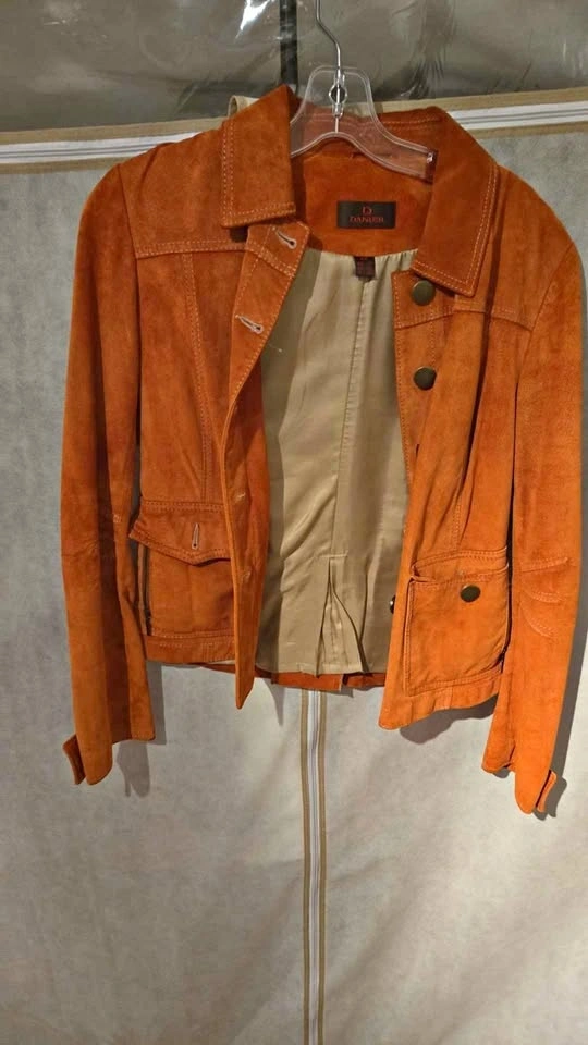 Burnt Orange Danier Suede Jacket. Inside pocket, outside pockets with small zip pocket. Designed in Canada, made in China. Size Small. Price $50. Bought new but it no longer fits me. From a smoke/pet-free home in the Heritage Mountain area. If the ad is up, it's still available.