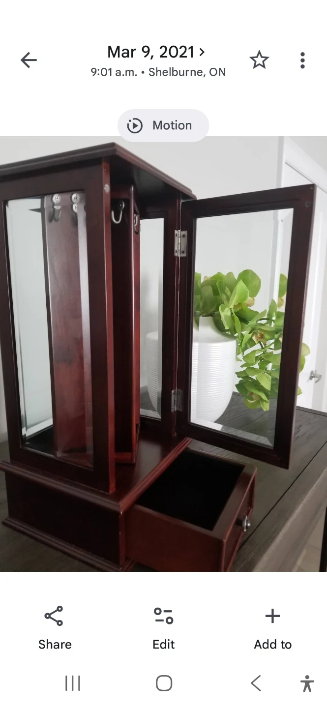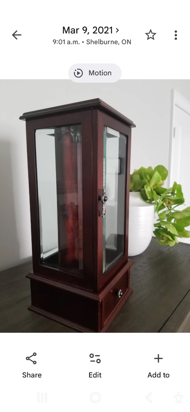 This jewellery box is made from dark wood and features a glass door to display your items. It has a small drawer at the bottom for extra storage. It's great for keeping your accessories organized.