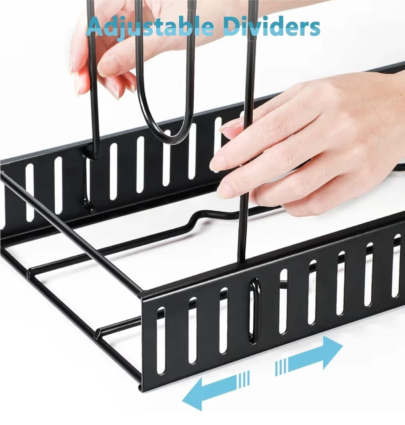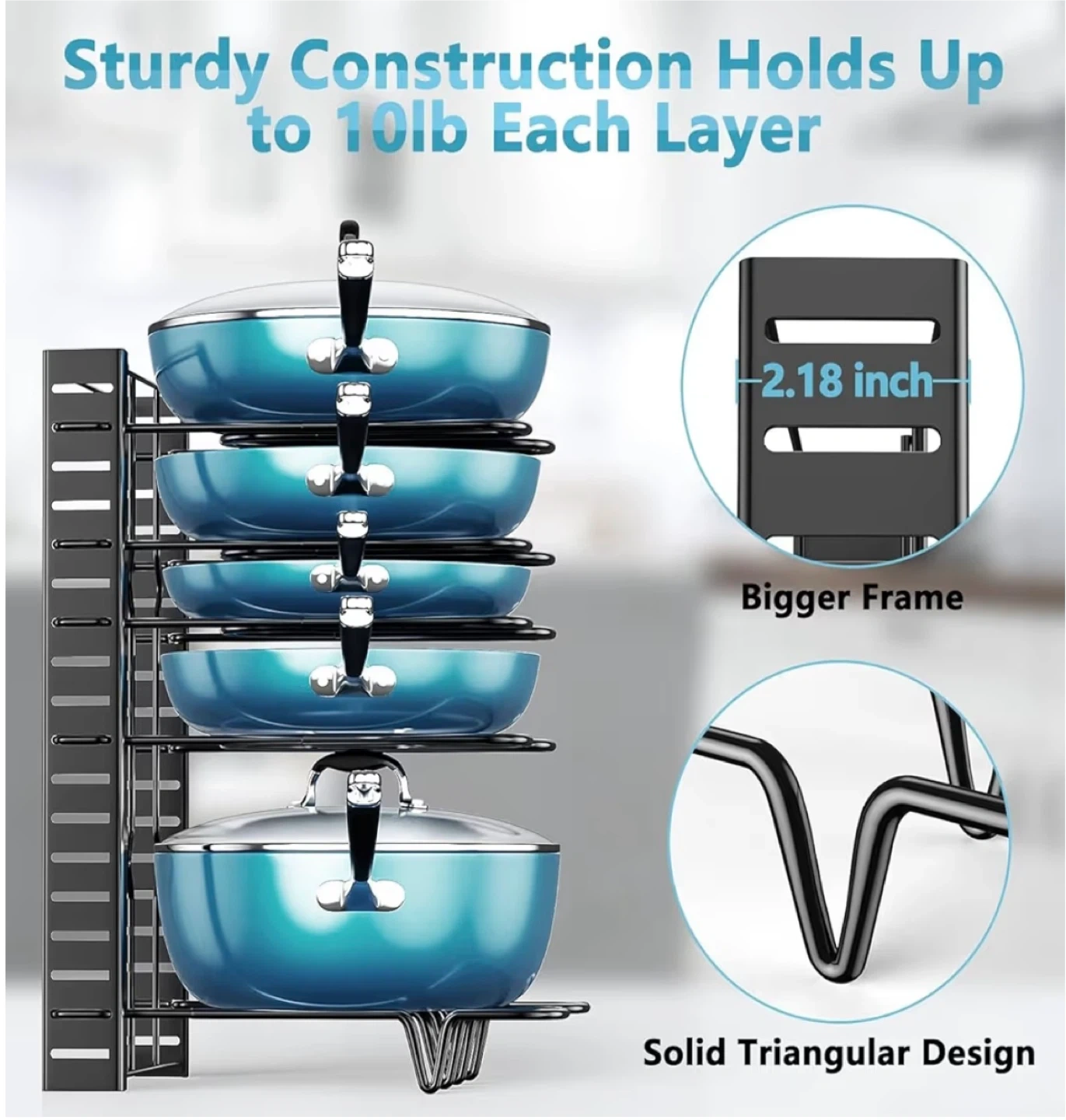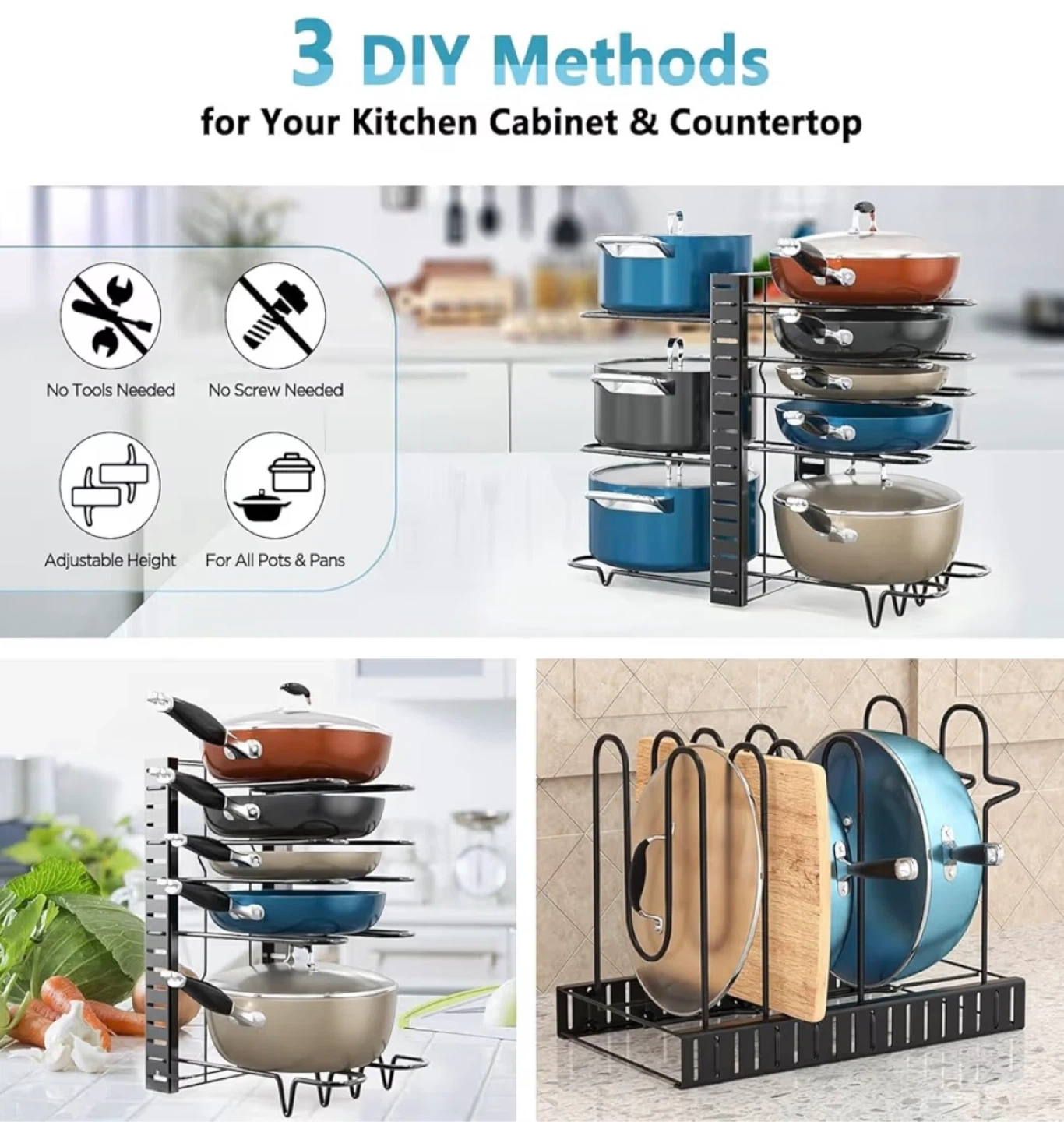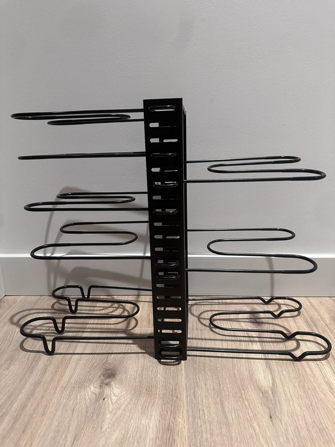 This organizer rack is designed to store pots, pans, and lids neatly in your kitchen. It's made of sturdy black metal and has multiple adjustable tiers. Keep your cookware organized and accessible!