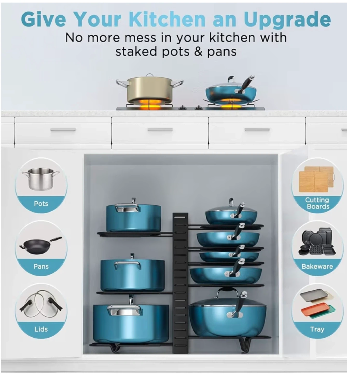 Excellent way to store your pots & pans. Efficient, easy to access, easy to see your cookware & its adjustable.