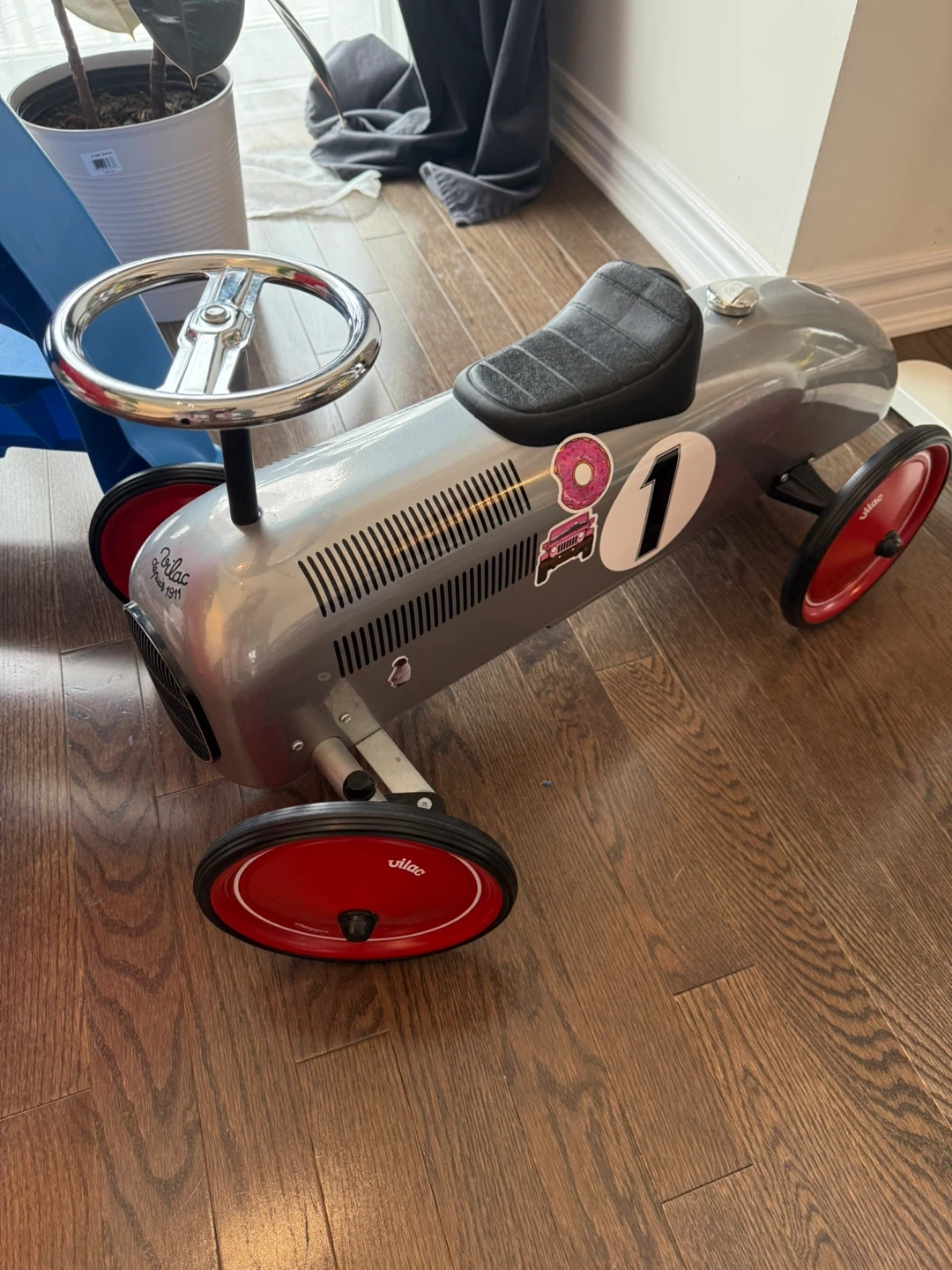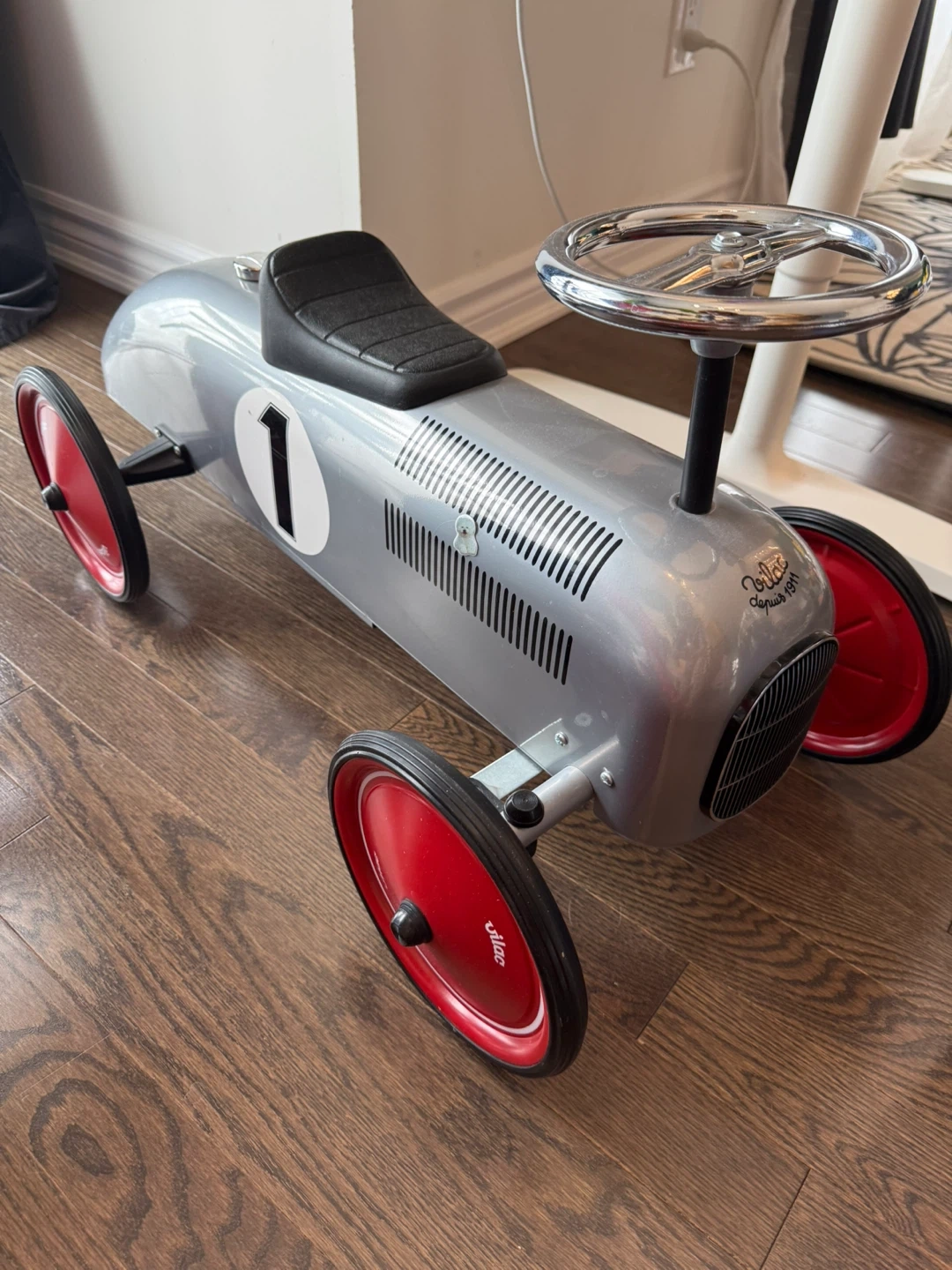 This Vilac ride-on toy car is designed like a classic race car. It features a silver body with red wheels and a black seat. It's a fun toy for little ones to cruise around in!