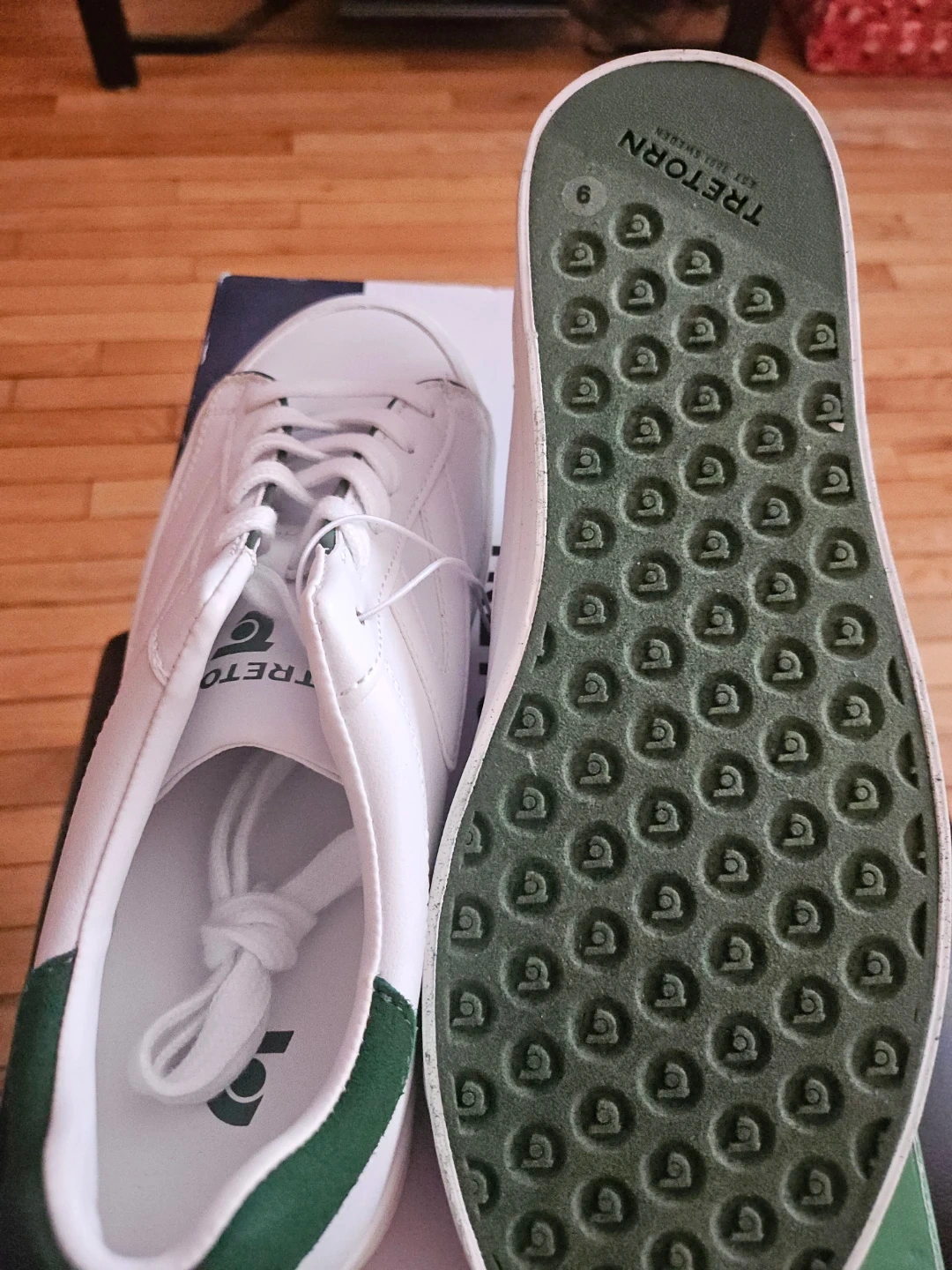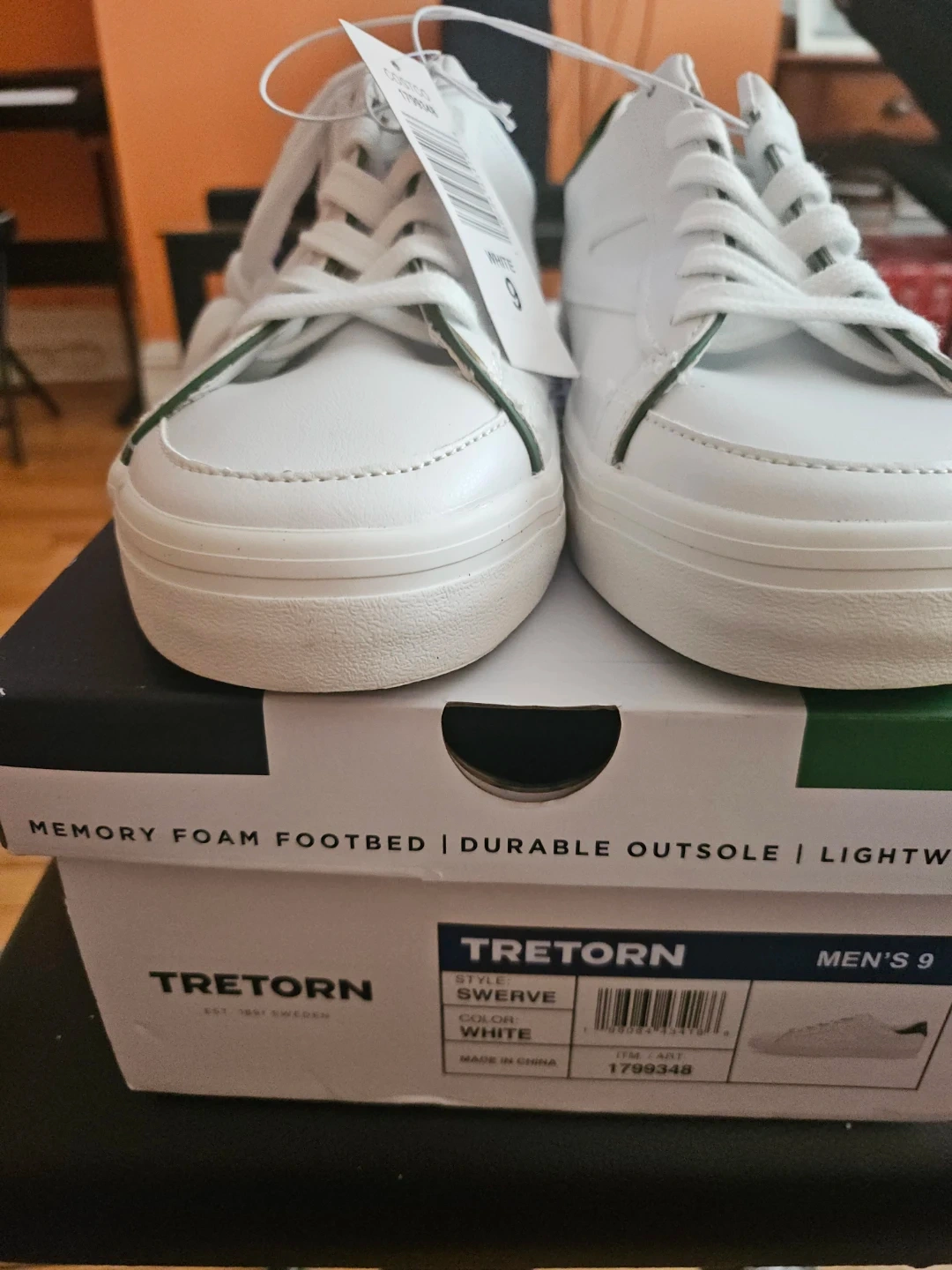 Tretorn Swerve sneakers in white. Men's size 9. Features a durable outsole and memory foam footbed. Comes with original box.