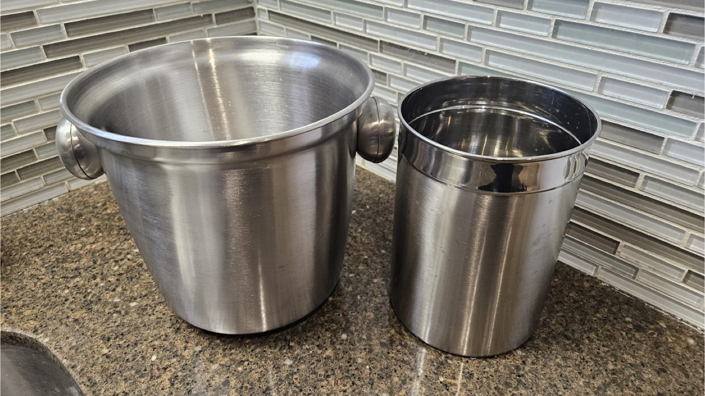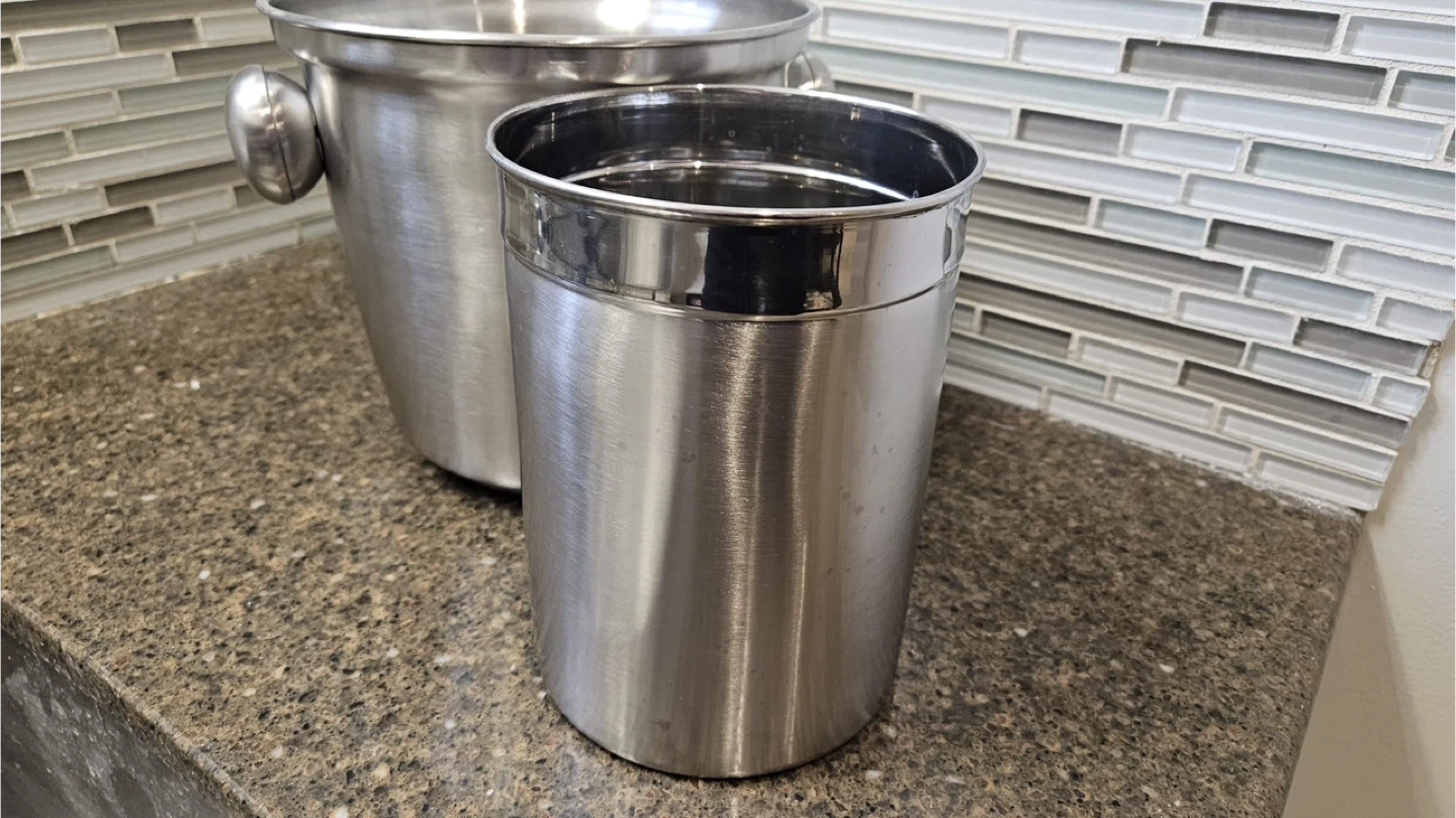 Two stainless steel buckets are included. One is a larger ice bucket with handles, and the other is a smaller metal container. Both are made of brushed stainless steel.
