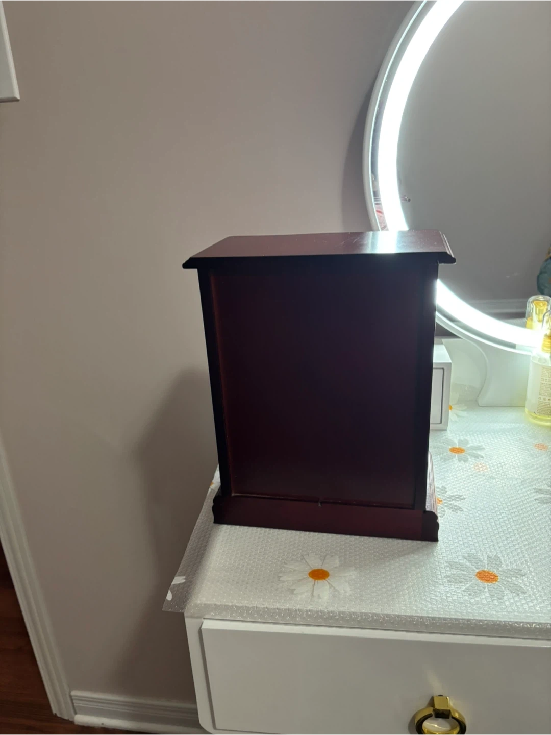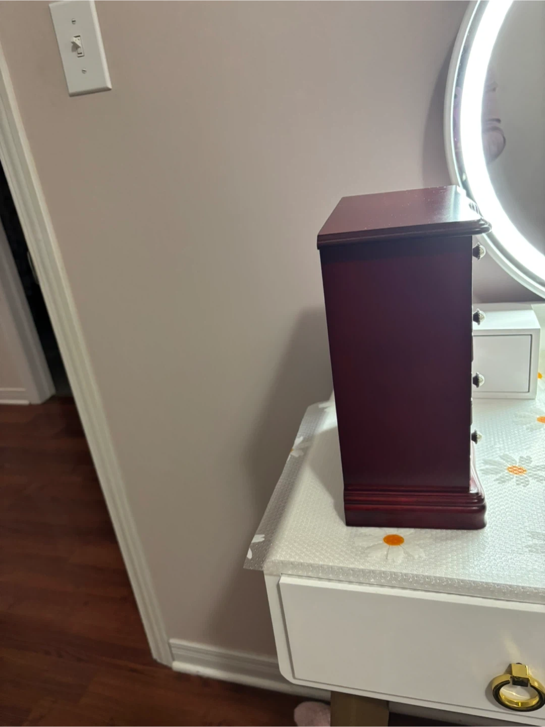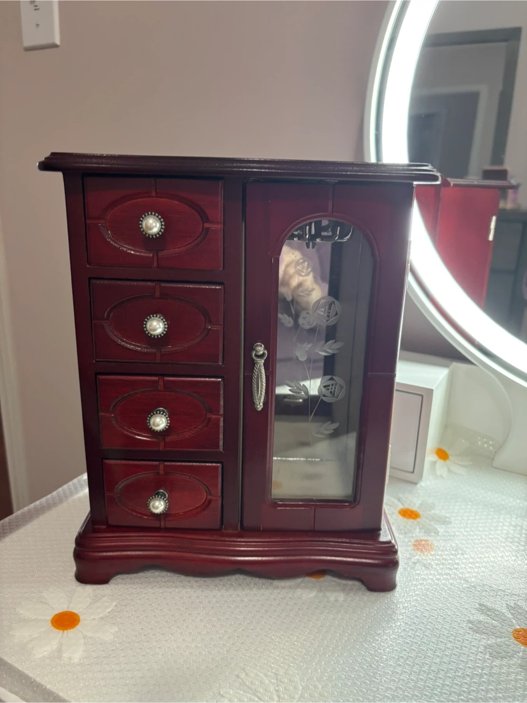 This is a beautiful wooden jewellery box with multiple drawers and a mirrored door. It's perfect for organizing your necklaces, rings, and other accessories. The interior features compartments to keep your items tidy and protected.
