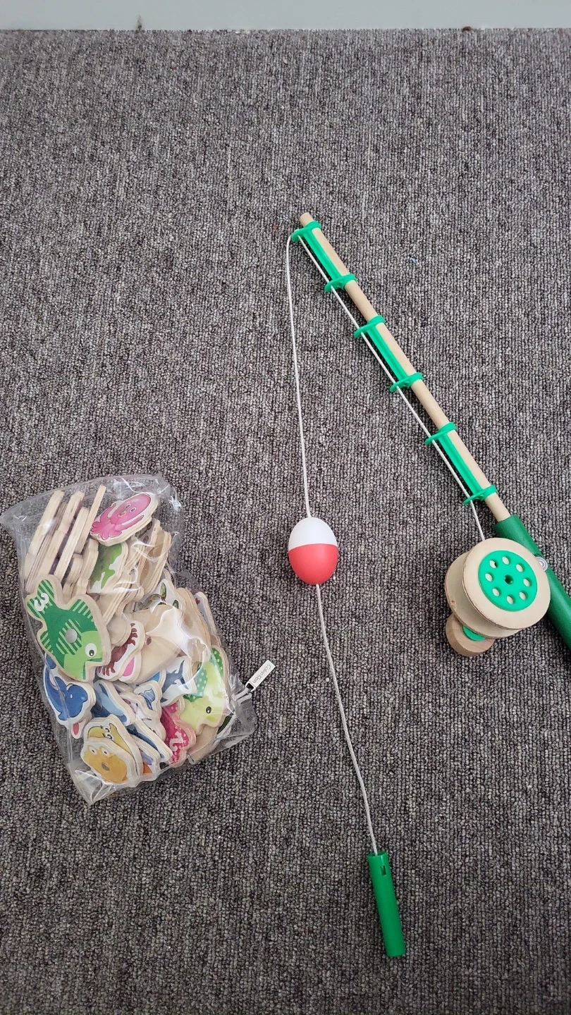 This is a fun magnetic fishing toy set. It includes a wooden fishing rod and a bag of colourful wooden fish and sea creatures. The pieces are magnetic and suitable for playtime!