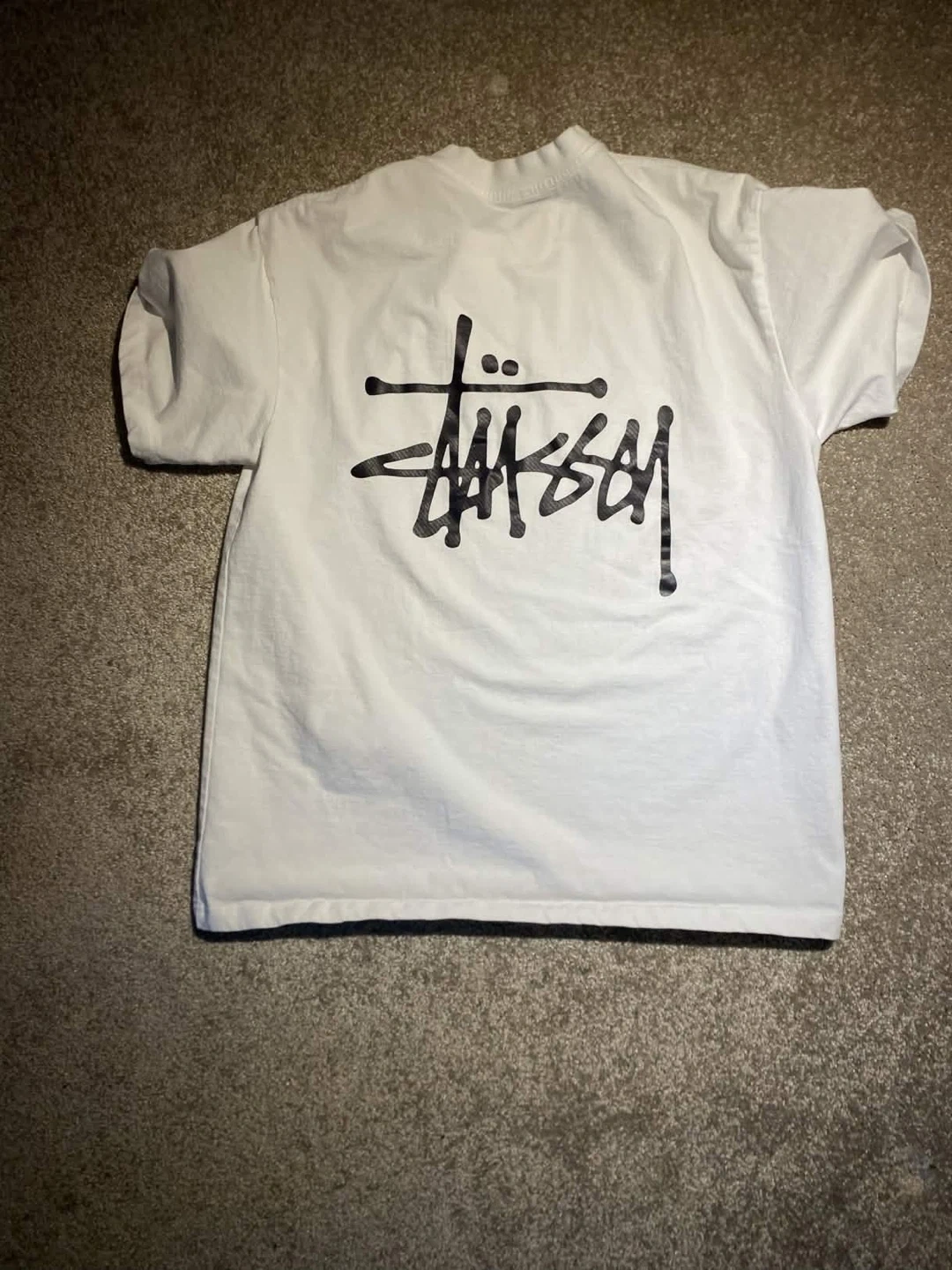 White Stüssy t-shirt with the iconic Stüssy logo printed on the front chest and a larger graphic on the back. Cotton material.