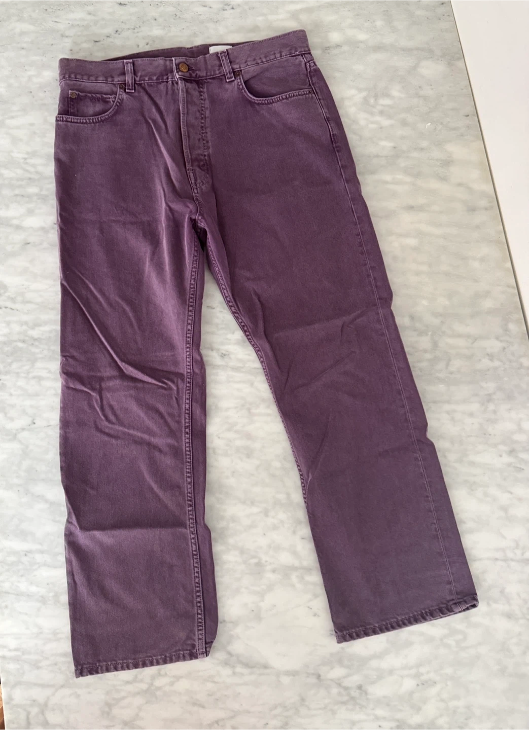These are Haikure italian made purple denim jeans. They feature a classic five-pocket style. They're great for everyday wear and have a great designer fit. The quality really shows. These jeans are straight legged, have a slimmer fit with no stretch.