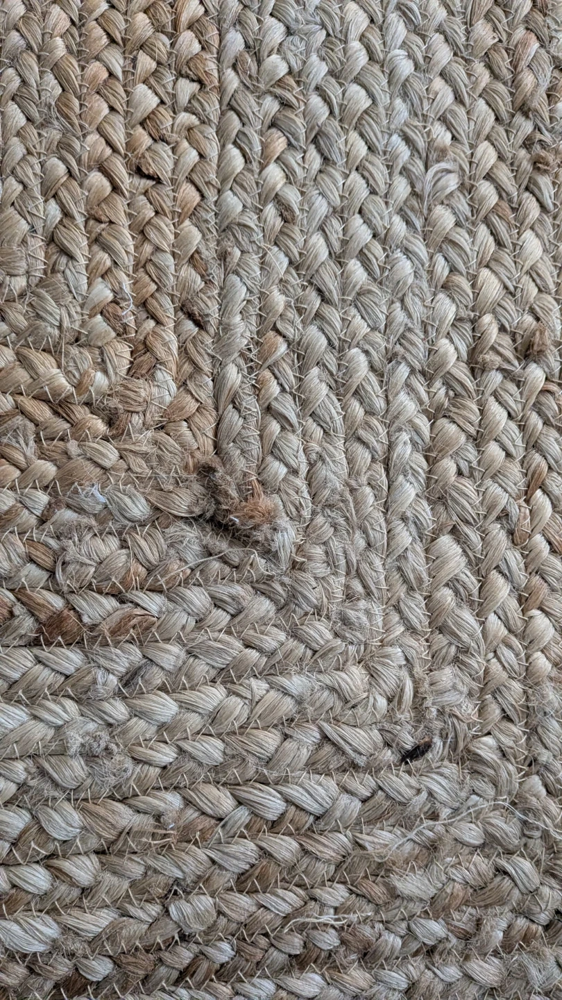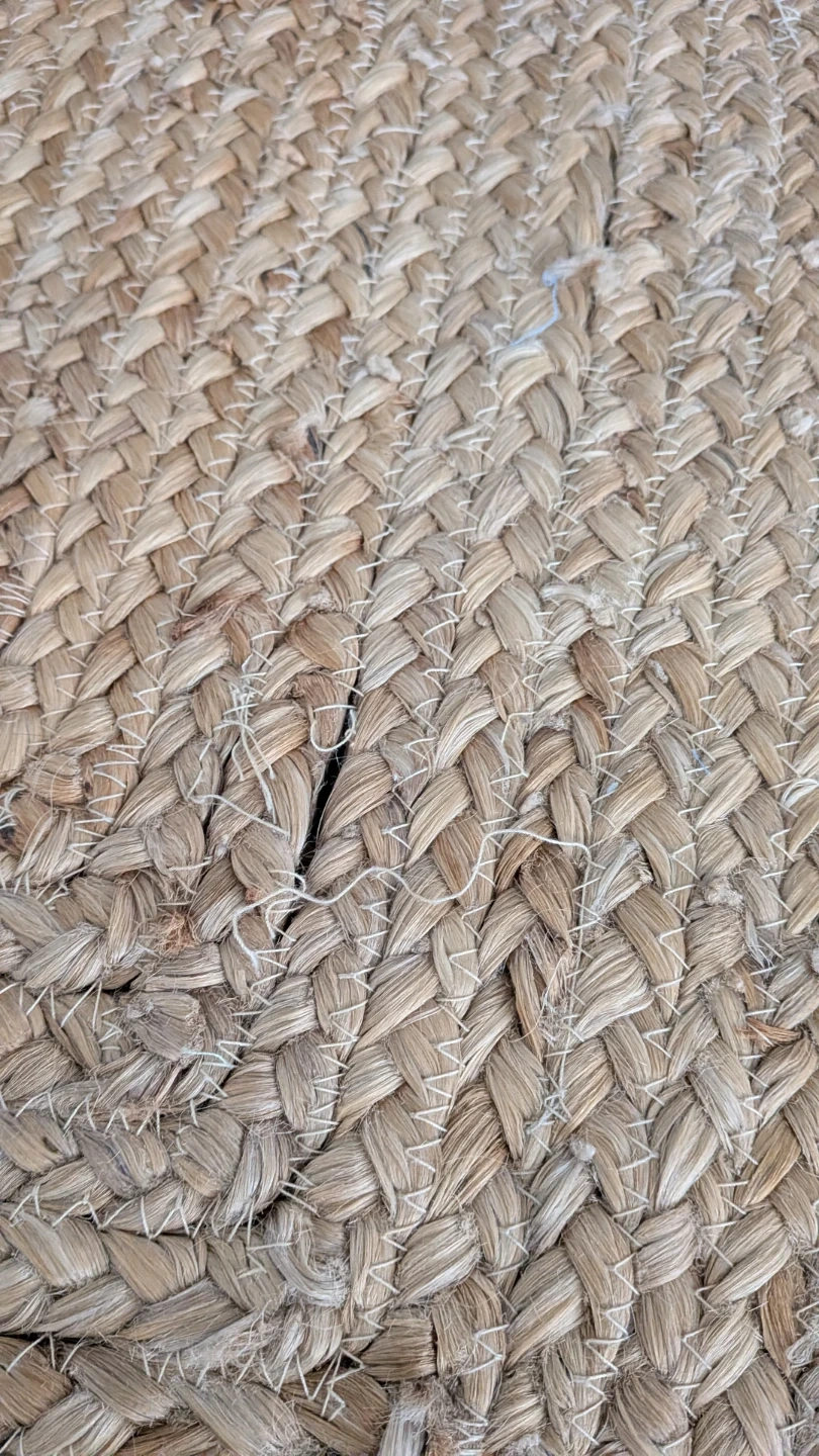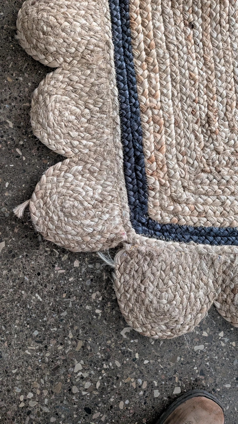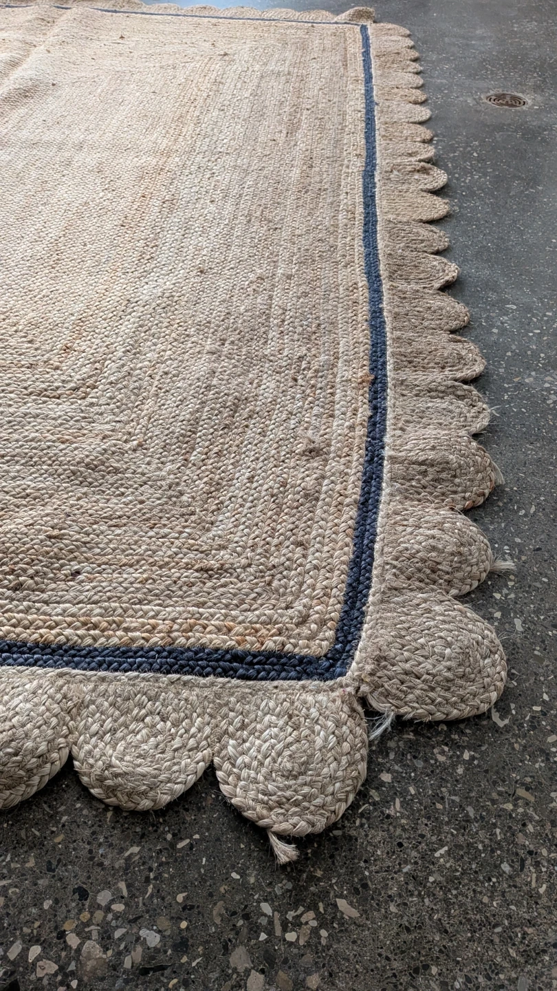 This is a Natural jute rug. It's a braided style with a blue border and scalloped edges. Made from natural jute material. Size is 8' x 10'. There's a small area of fraying in one spot and a few loose threads visible, but overall very good condition.