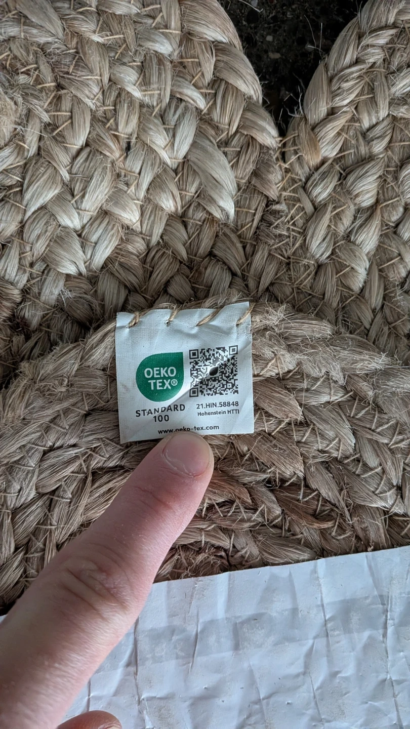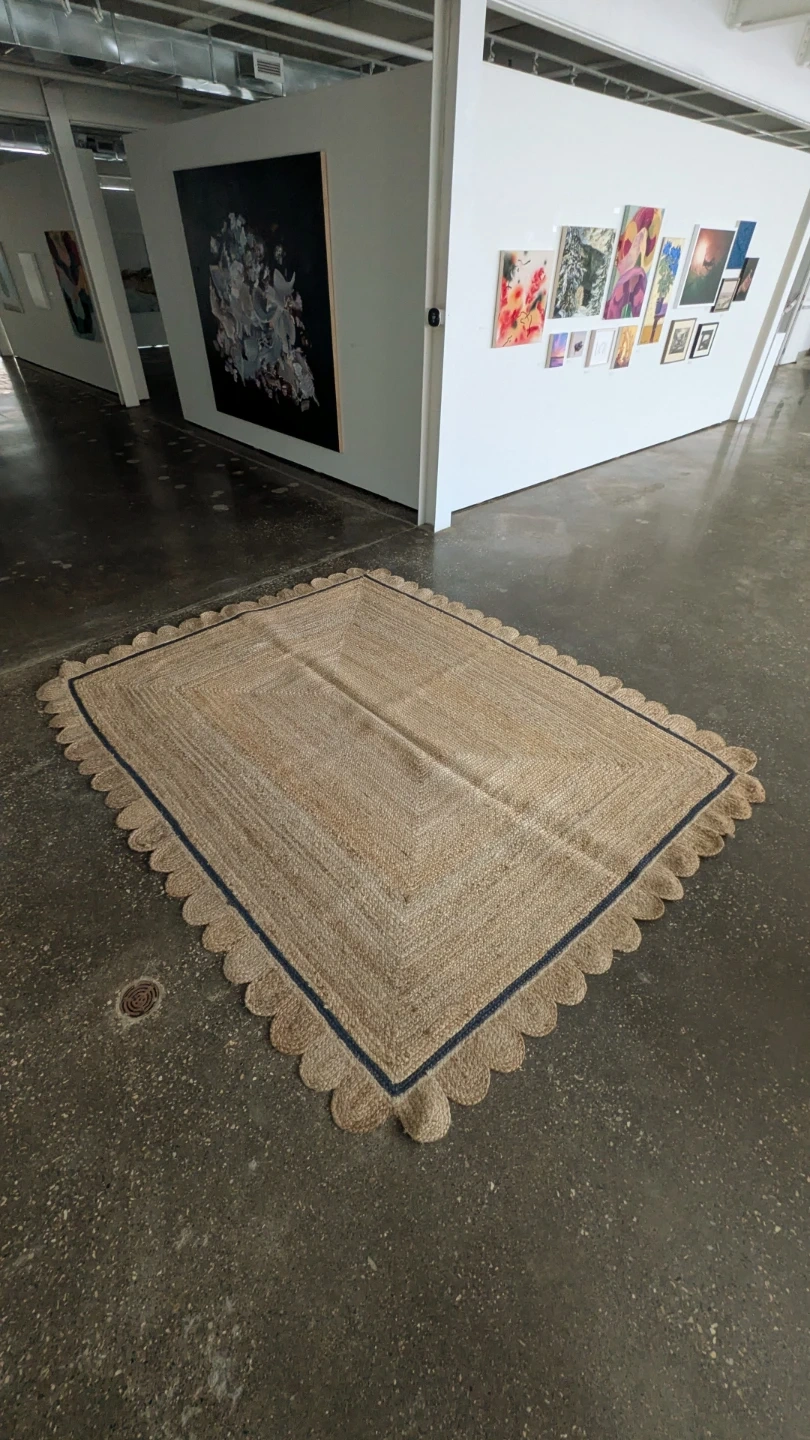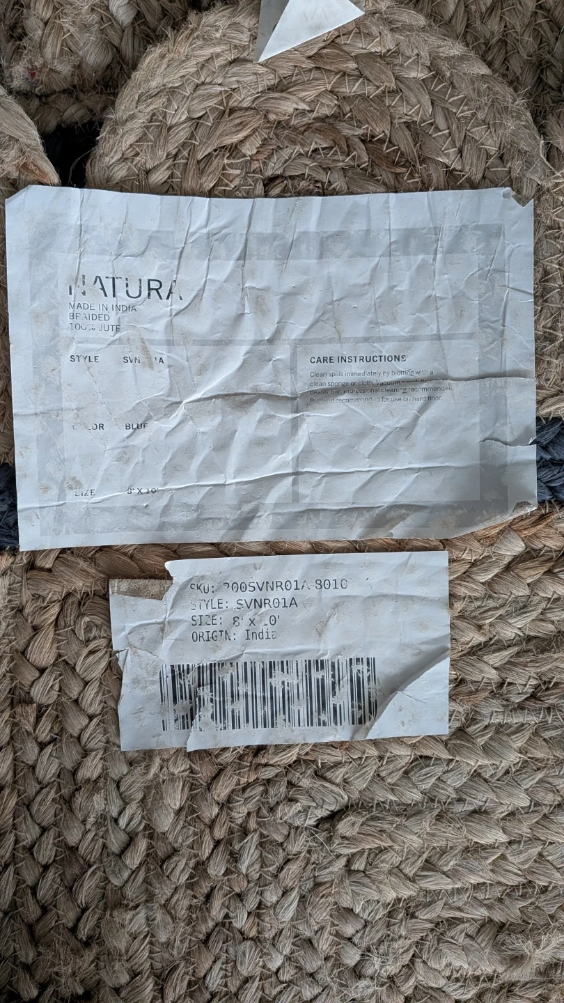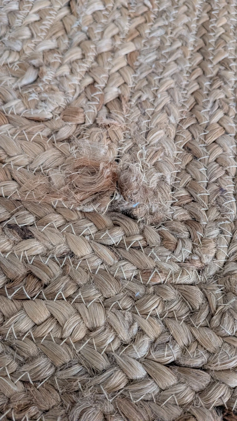This is a Natural jute rug. It's a braided style with a blue border and scalloped edges. Made from natural jute material. Size is 8' x 10'. There's a small area of fraying in one spot and a few loose threads visible, but overall very good condition.