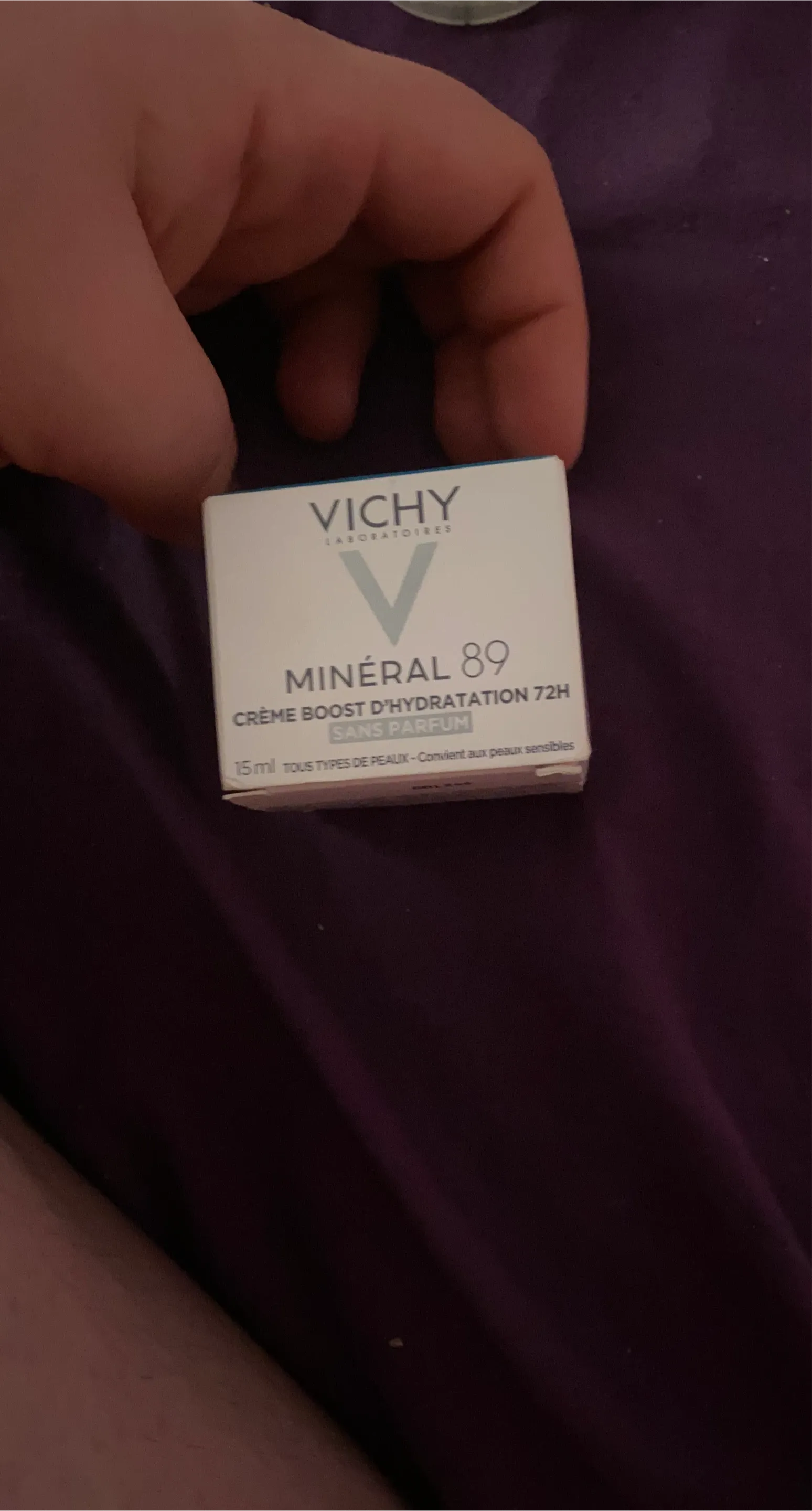 This is a 15ml bottle of Vichy Minéral 89 Crème Boost D'Hydratation 72H. It's fragrance-free and suitable for all skin types, including sensitive skin. This cream provides 72-hour hydration boost.