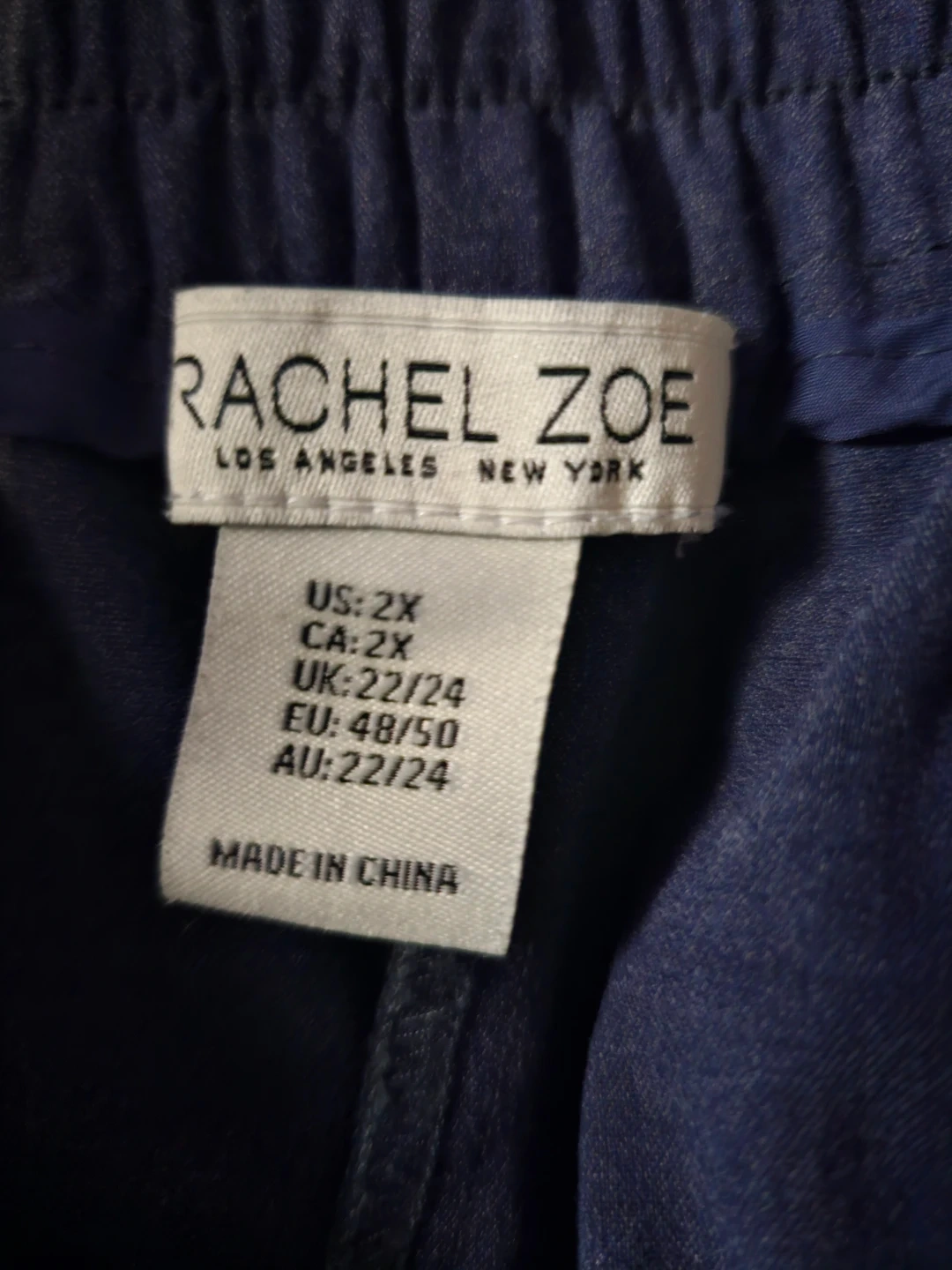Rachel Zoe women's dress pants in a size 2X. These pants are blue and made from a polyester blend. They feature a button and zip closure.