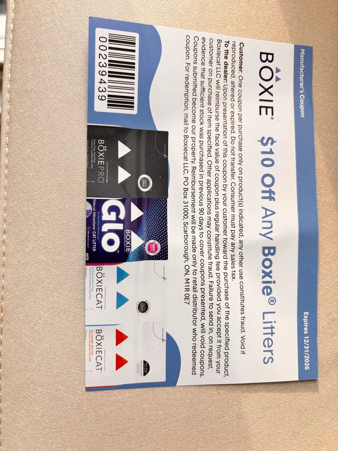 This is a manufacturer's coupon for $10 off any Boxie® Litters. It expires on 12/21/2026. Continuous odour control with probiotics. 99.9% dust free.