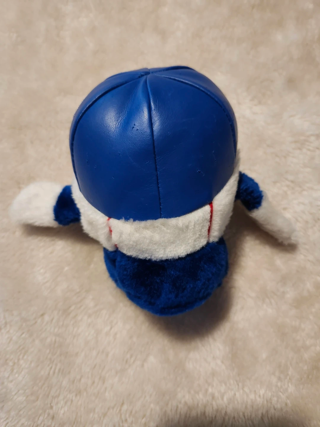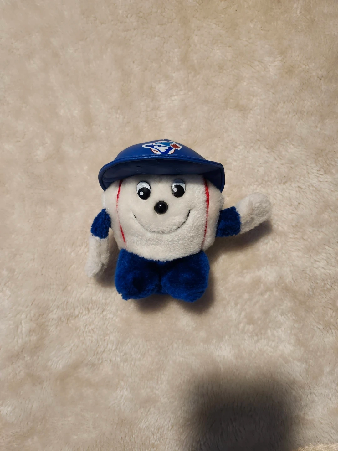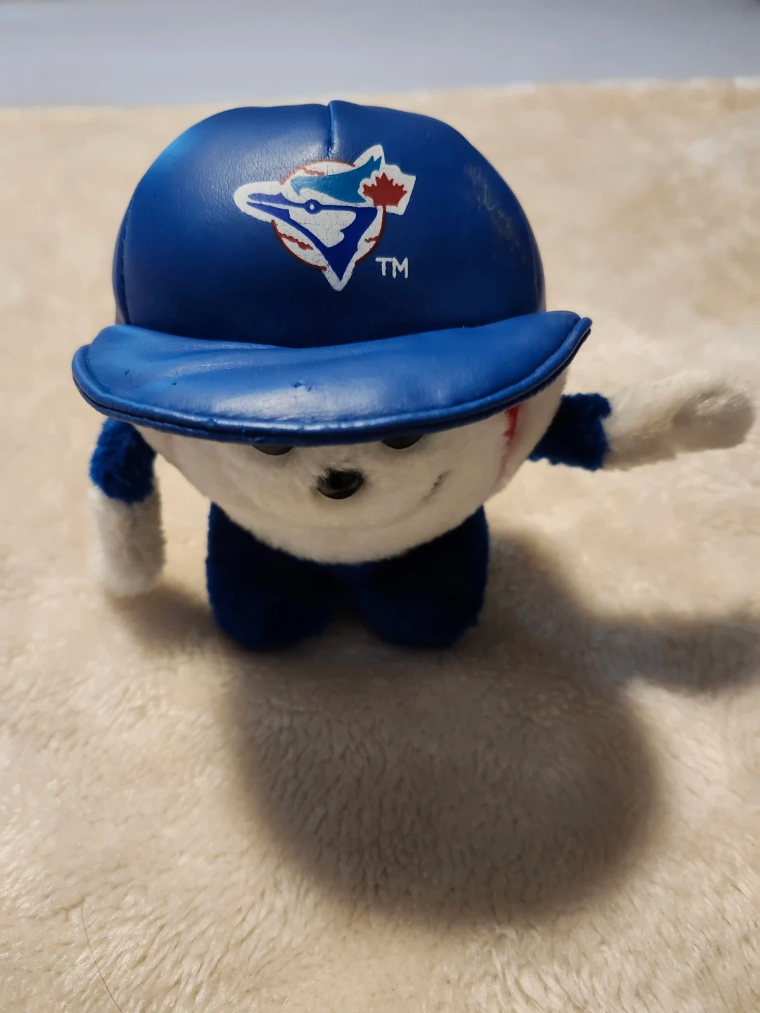 This is a plush toy featuring the Toronto Blue Jays logo and colours. It's soft and cuddly. A fun item for any baseball fan or collector!