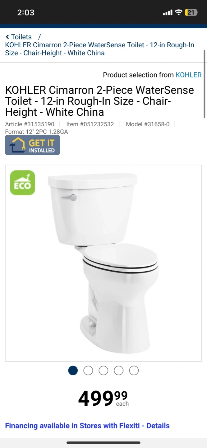 This is a new Kohler Cimarron 2-piece toilet in white. It's a 1.28 gallons per flush model with a chair-height design. Includes the seat.