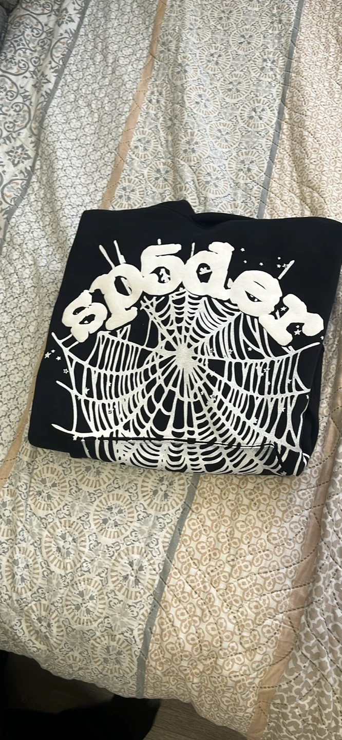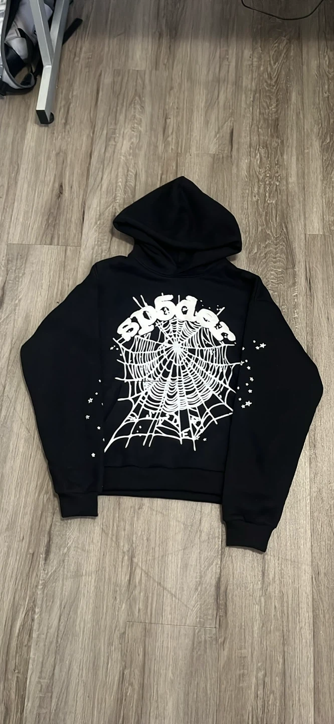 Black Sp5der hoodie with a white spider web graphic on the front. Size medium.