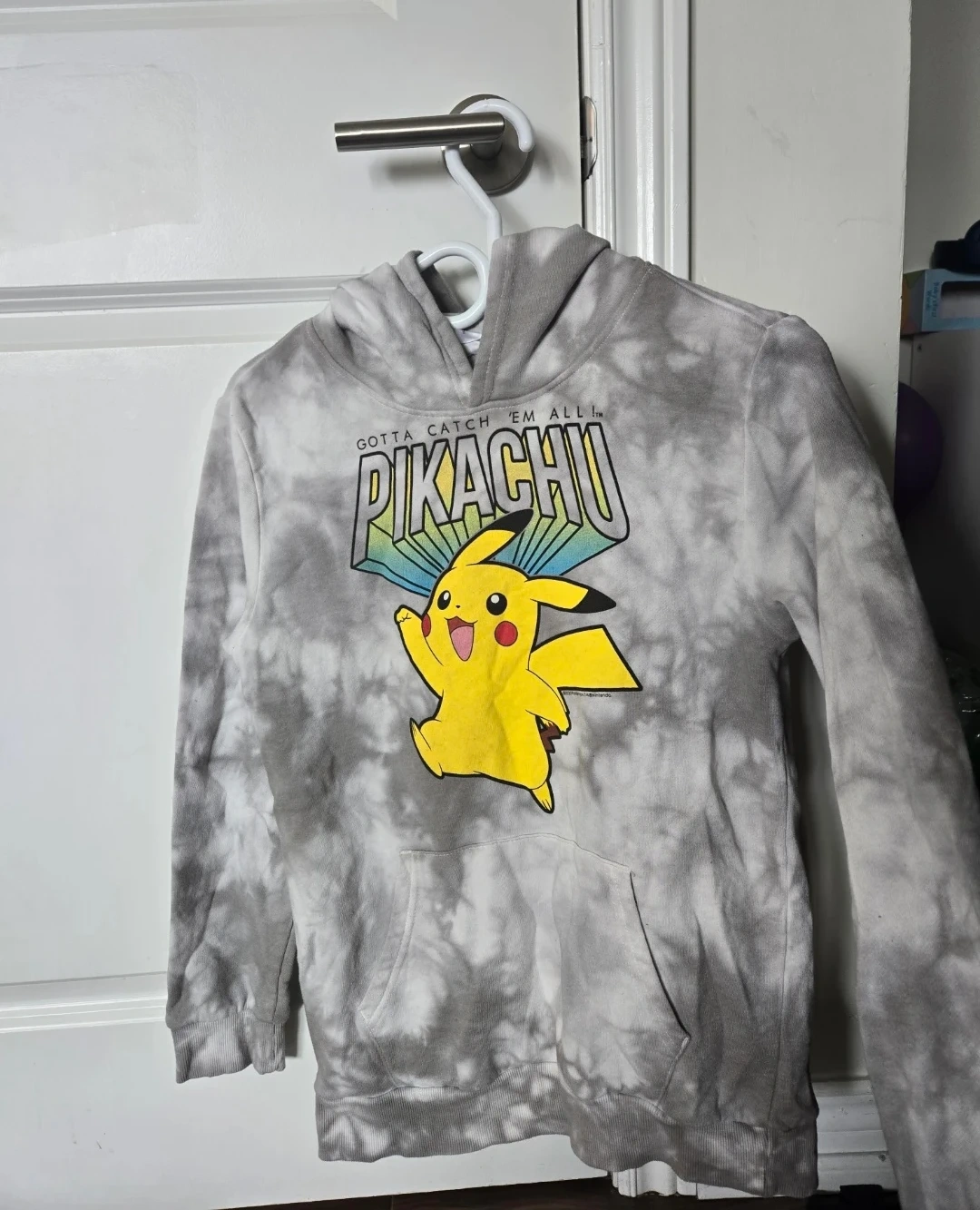 This grey and white tie-dye hoodie features a large Pikachu graphic with "Gotta Catch 'Em All!" text. size XL (14-16).