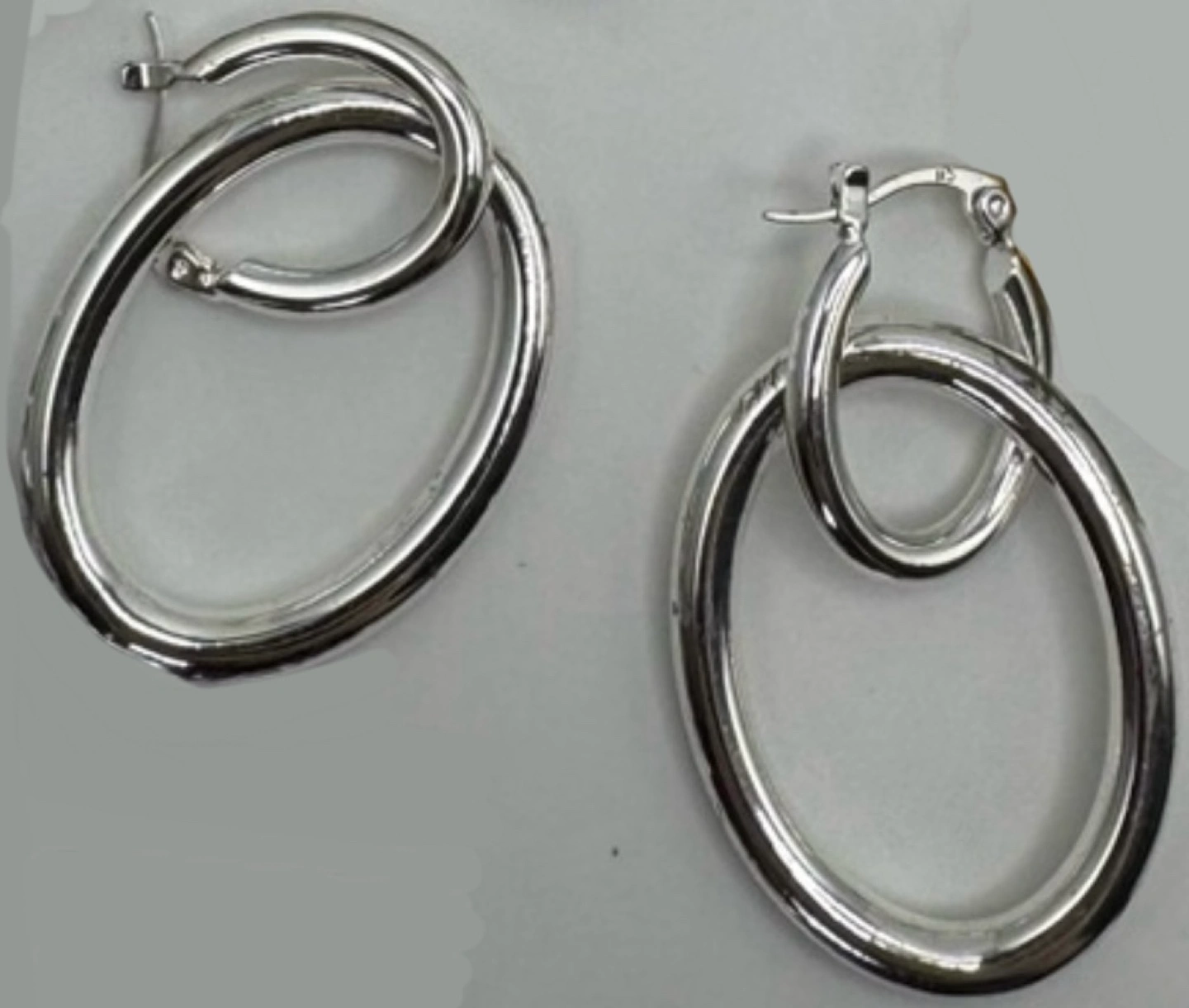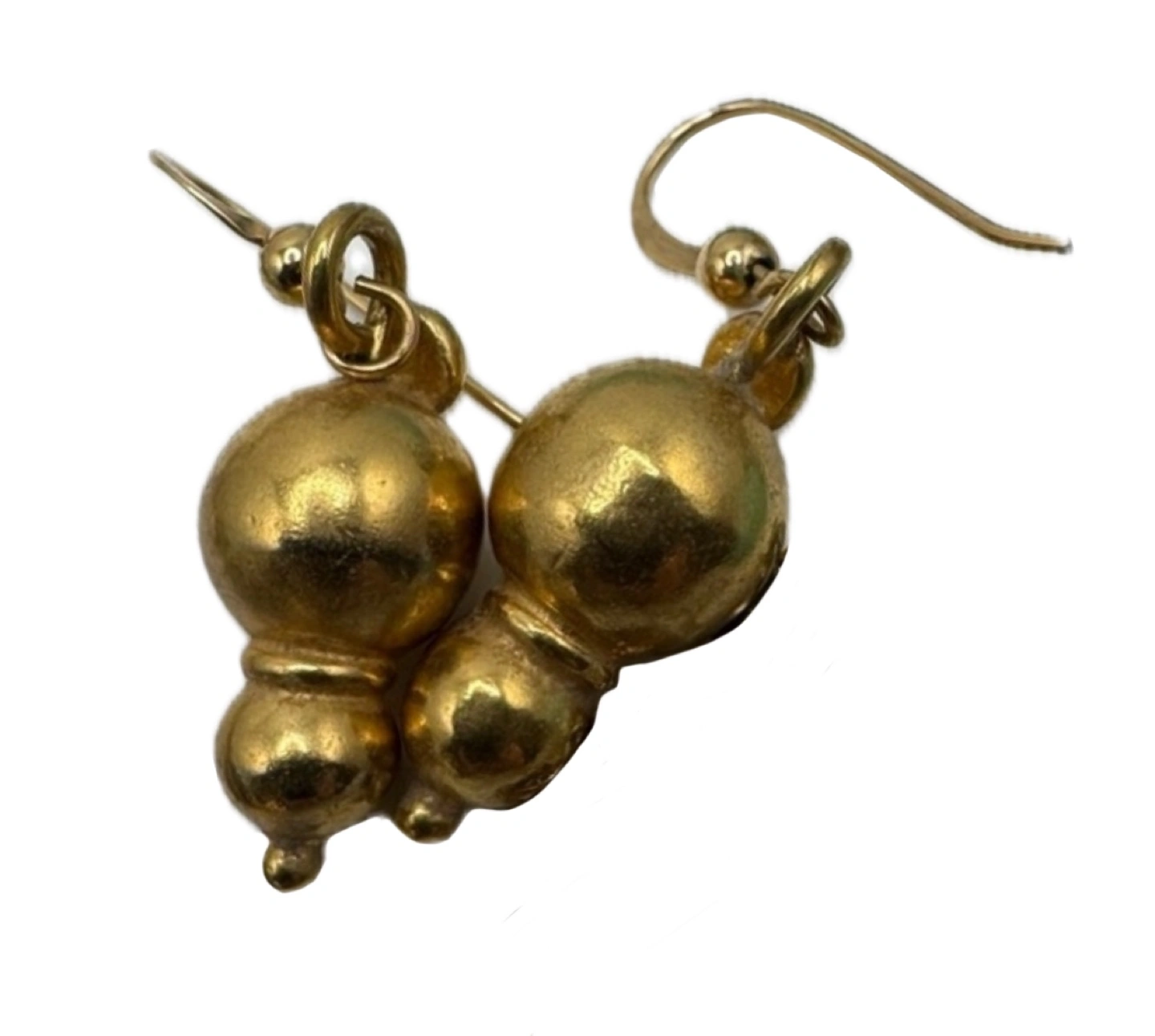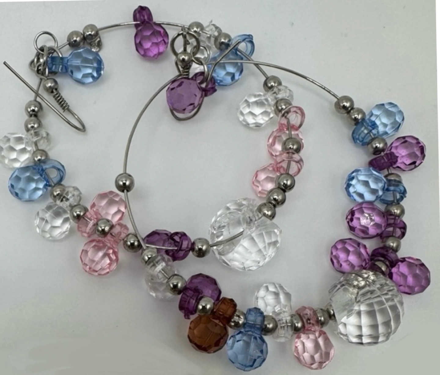 Three pairs of earrings. Silver double hoop earrings. Beaded wire hoop earrings, pastel colours. Gold double ball dangle earrings. Pre-owned.