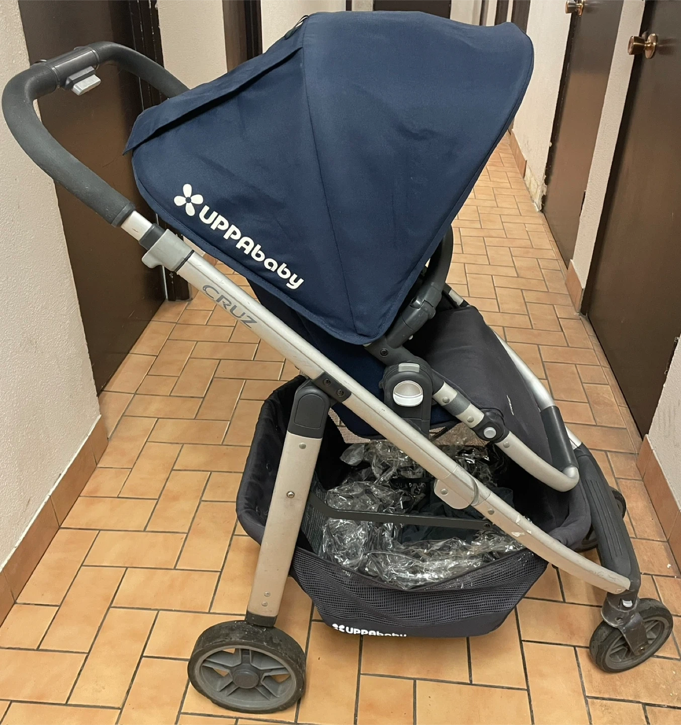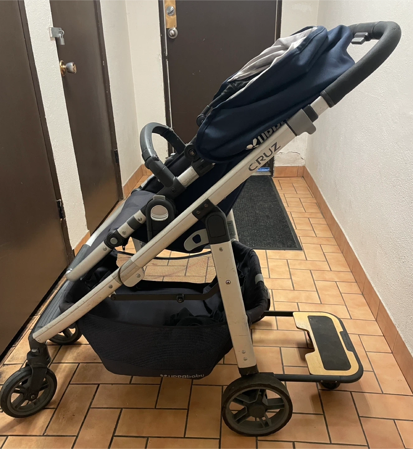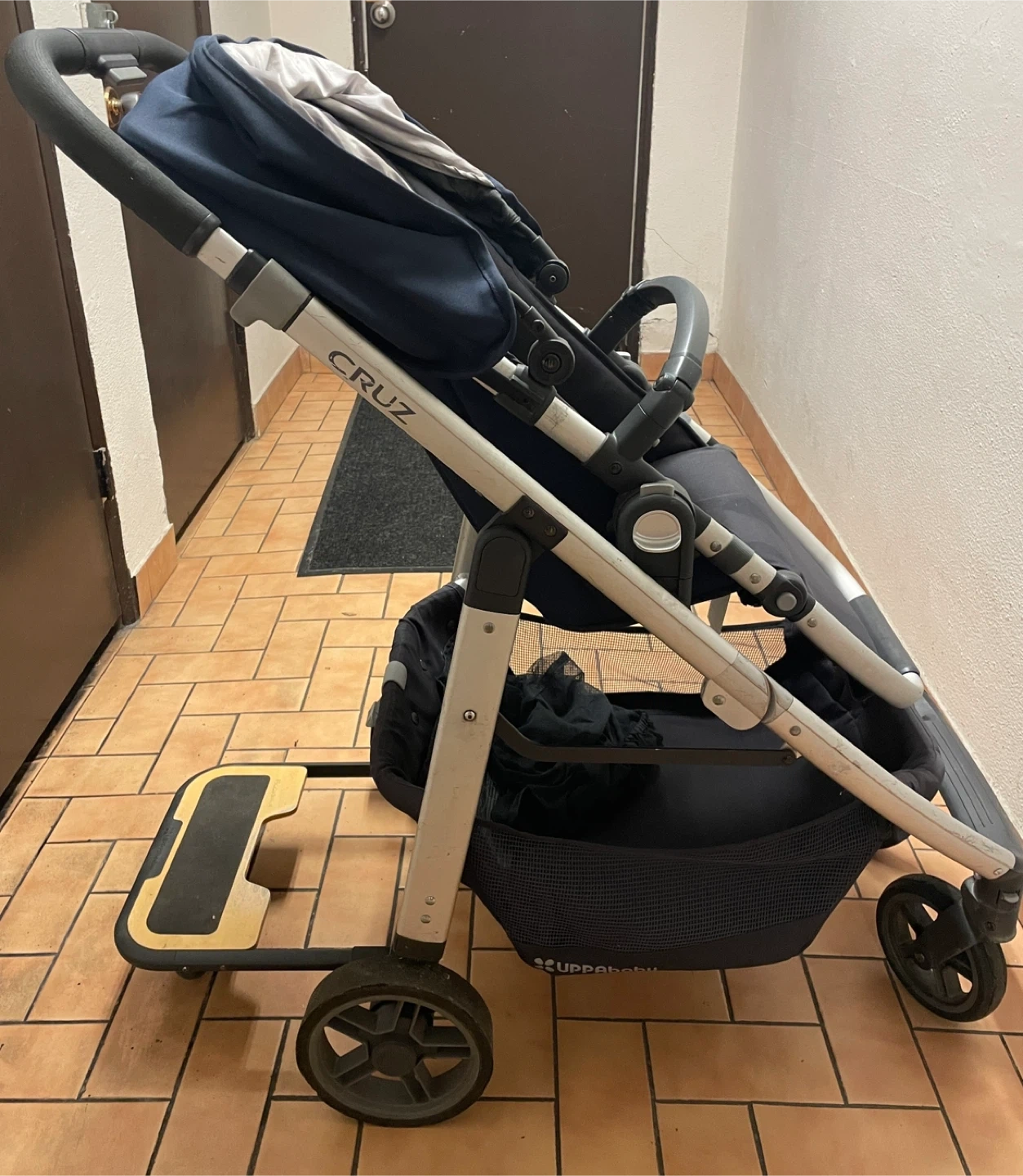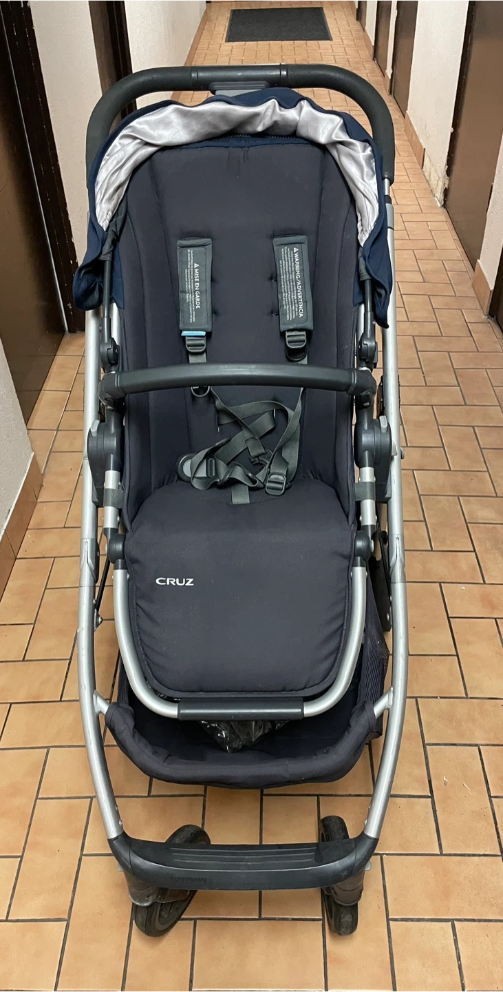 This navy UPPAbaby Cruz stroller is in good condition. It features a large storage basket and a smooth ride. Includes the RumbleSeat piggyback board for a second child!