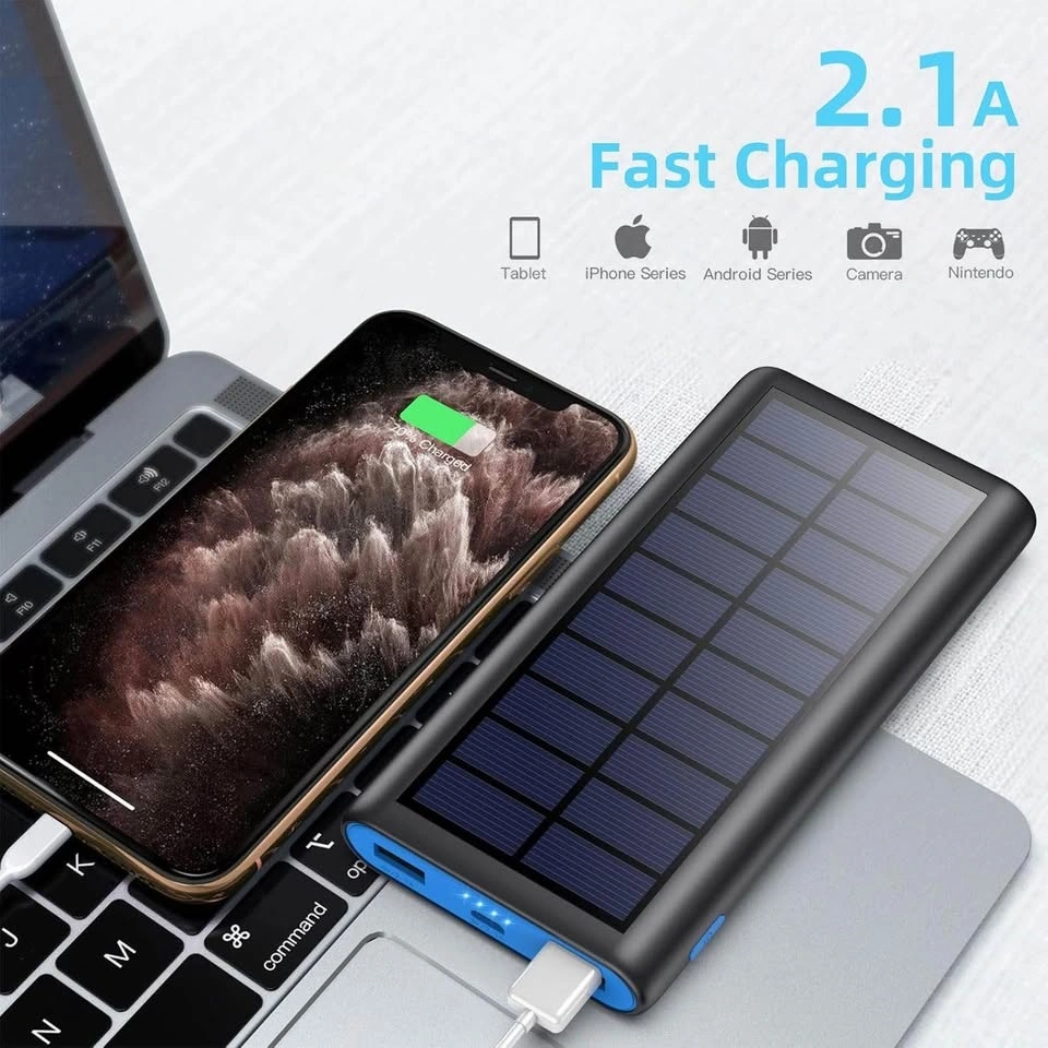 This is a 26800mAh portable power bank with dual charging methods: via a 5V/2.1A adapter or its built-in solar panels for emergency backup. It's compatible with iPhones, iPads, Samsung Galaxy, and most other smartphones and tablets, capable of charging devices 6-8 times. Great for travel and outdoor activities. Please note the solar charging is intended as an emergency backup, not a primary power source.
