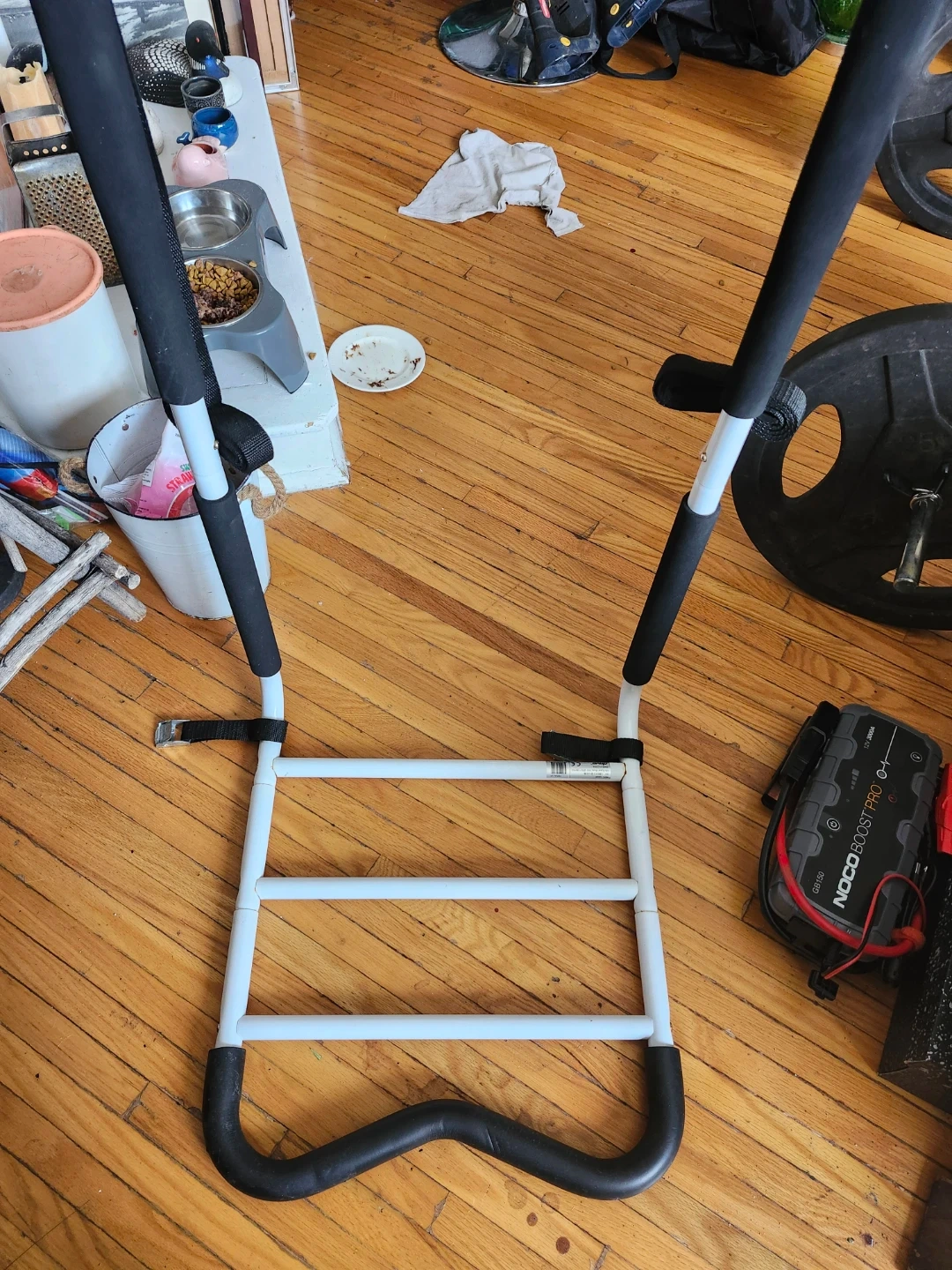 This bedside assist bar offers stability when getting in and out of bed. It features a white metal frame with black padded grips. Straps are included for securing it to the bed frame.