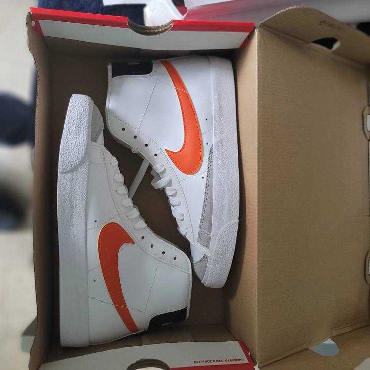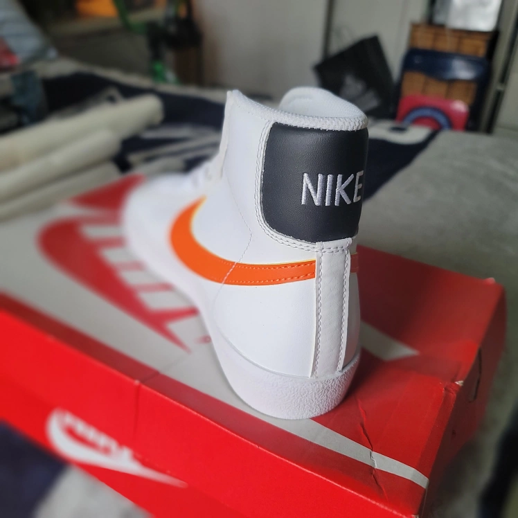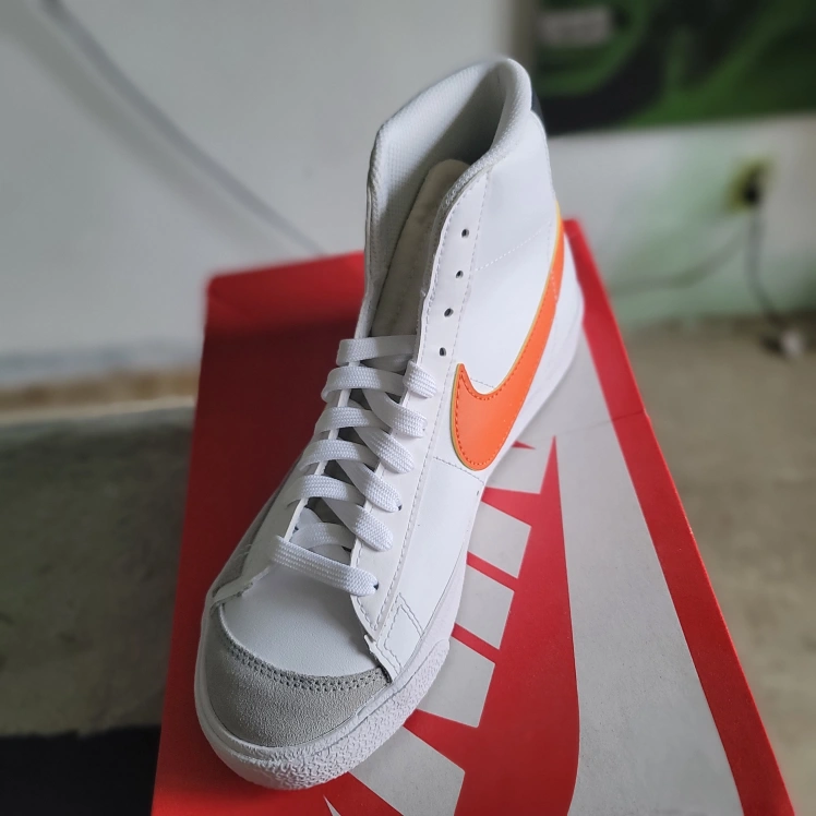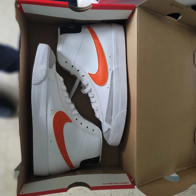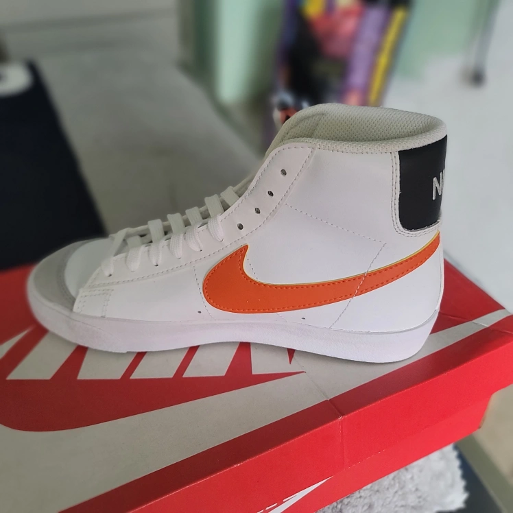 Selling a pair of Nike Blazer Mid '77 sneakers in white with orange swoosh. These classic kicks are in great condition and come with the original box!