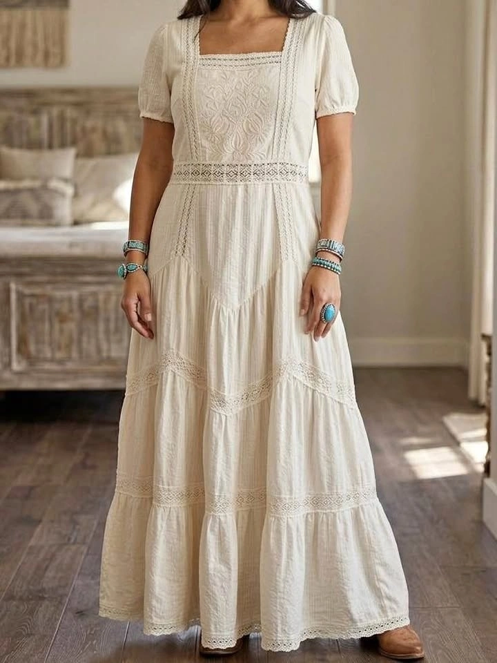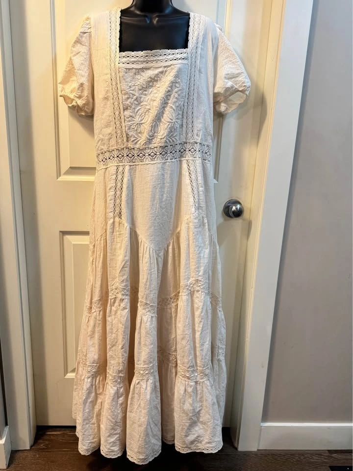 Beautifully detailed maxi dress from the exclusive Kemo Sabe western collaboration. Features a square neckline with intricate lace-pieced detailing, puff sleeves, and a flattering tiered skirt. The fabric is a soft, breathable cotton with delicate embroidery throughout. Perfect for a coastal cowgirl look, bridal events, or summer festivals.
