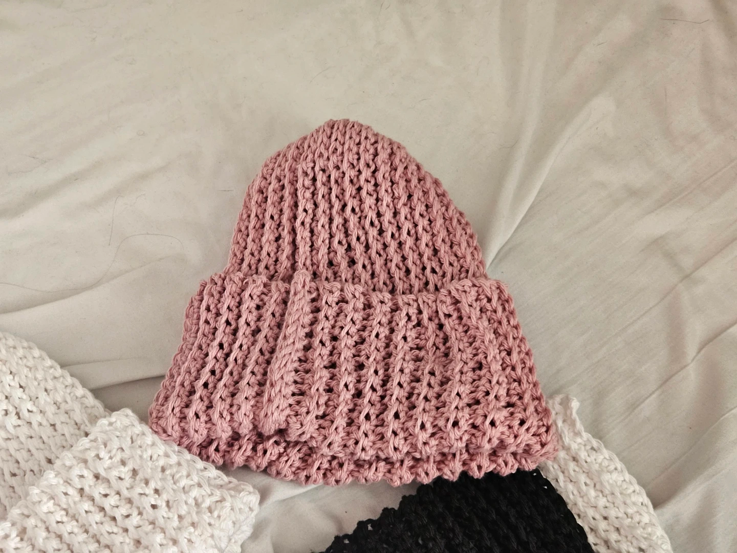 This set includes a white knitted hat with a pink knitted hat and a pink and white striped scarf. They're made from a soft, chunky yarn, perfect for keeping warm. The hats have a folded brim for extra coziness.