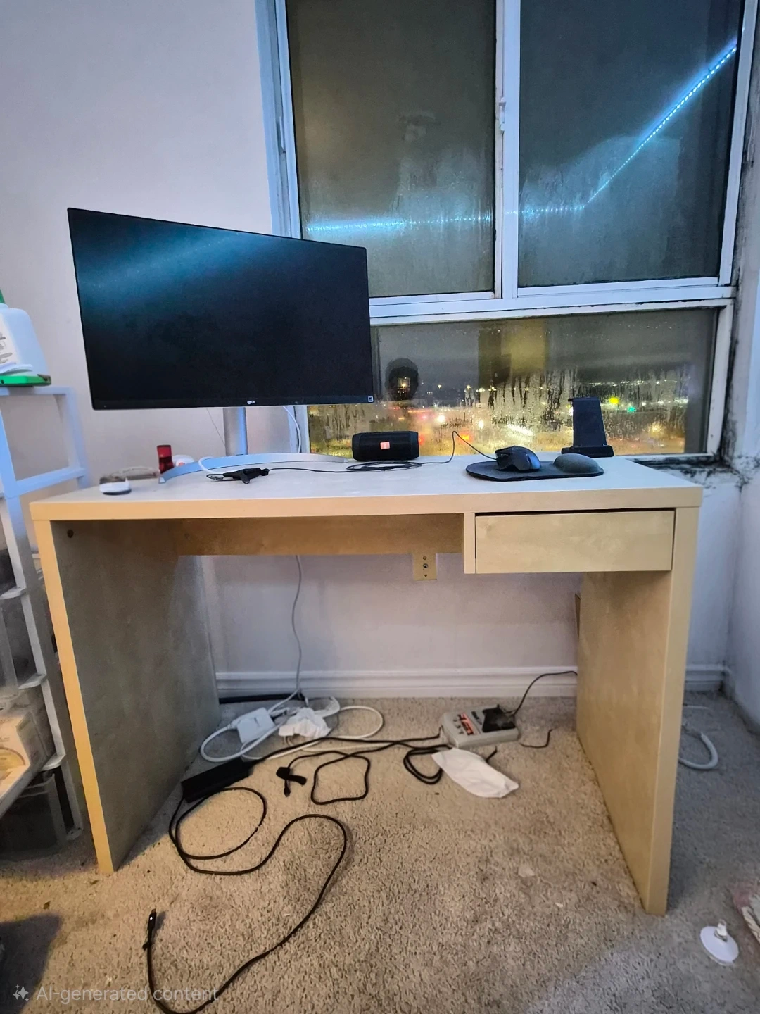 Simple wood desk with one drawer. It's great for a home office or study area. Measurements are approximately 47 inches wide, 23.5 inches deep, and 29 inches tall.