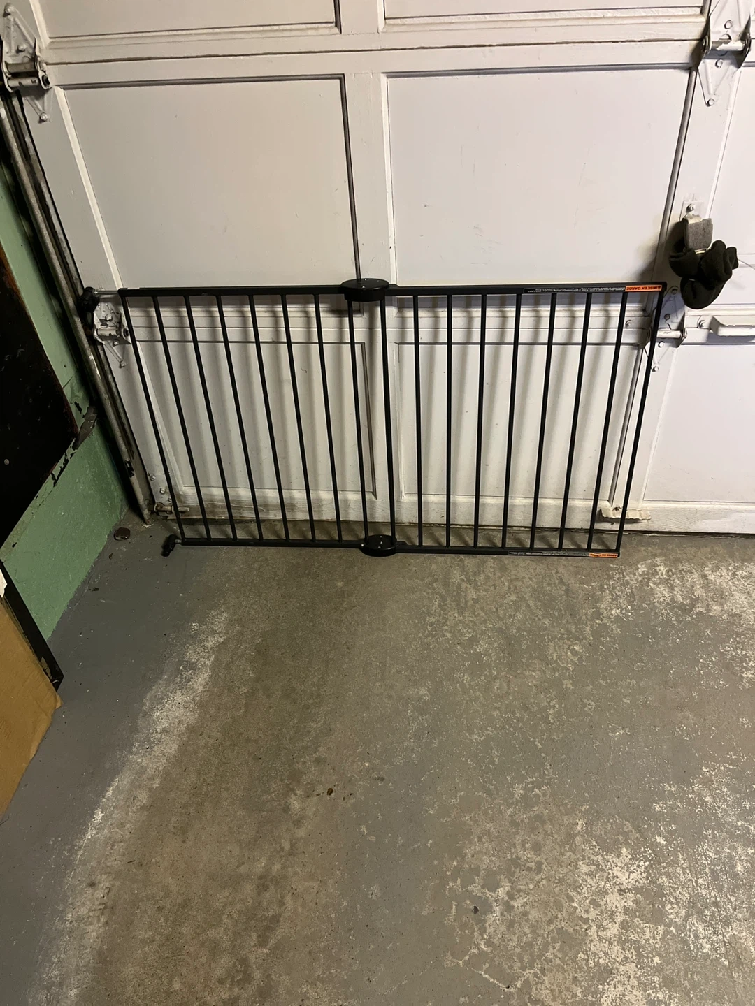 This is a pressure-mounted baby gate with a walk-through door. It's made of metal and wood accents. The gate is adjustable to fit different openings.