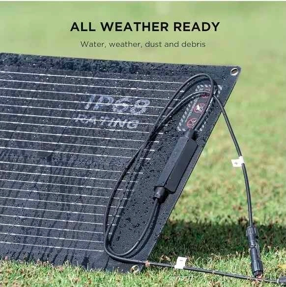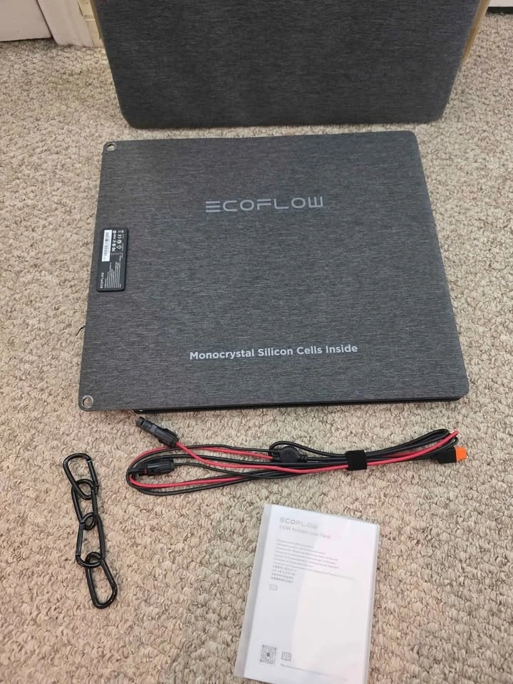 EcoFlow 110W Solar Panel with Monocrystalline cells for high efficiency (up to 23% conversion rate). It's IP68 rated for water and dust resistance. The panel folds compactly into a carry case that doubles as an adjustable kickstand (0-180°). Universally compatible with EcoFlow RIVER/DELTA stations and other generators. Let me know if you're interested!