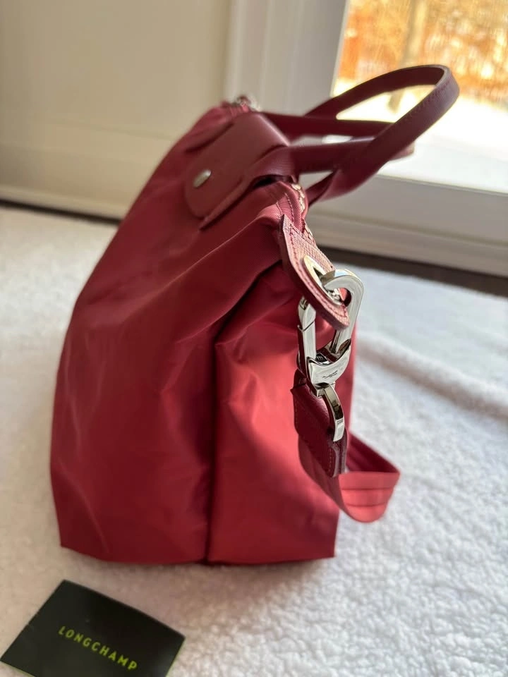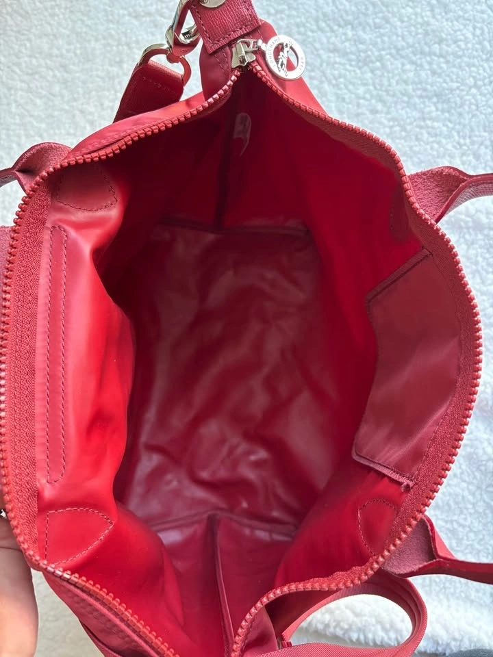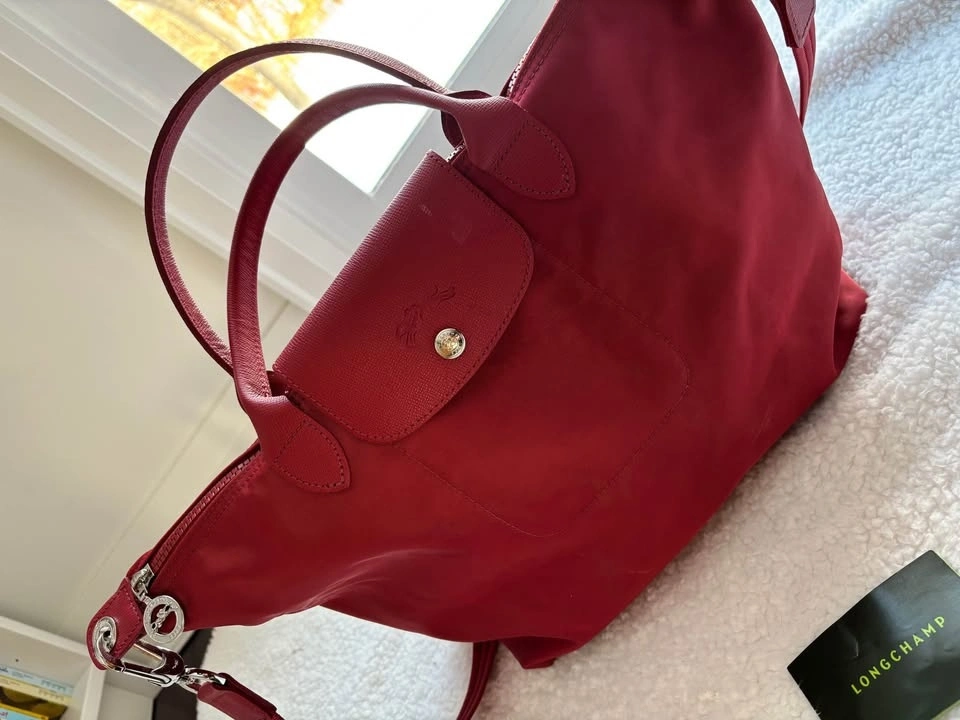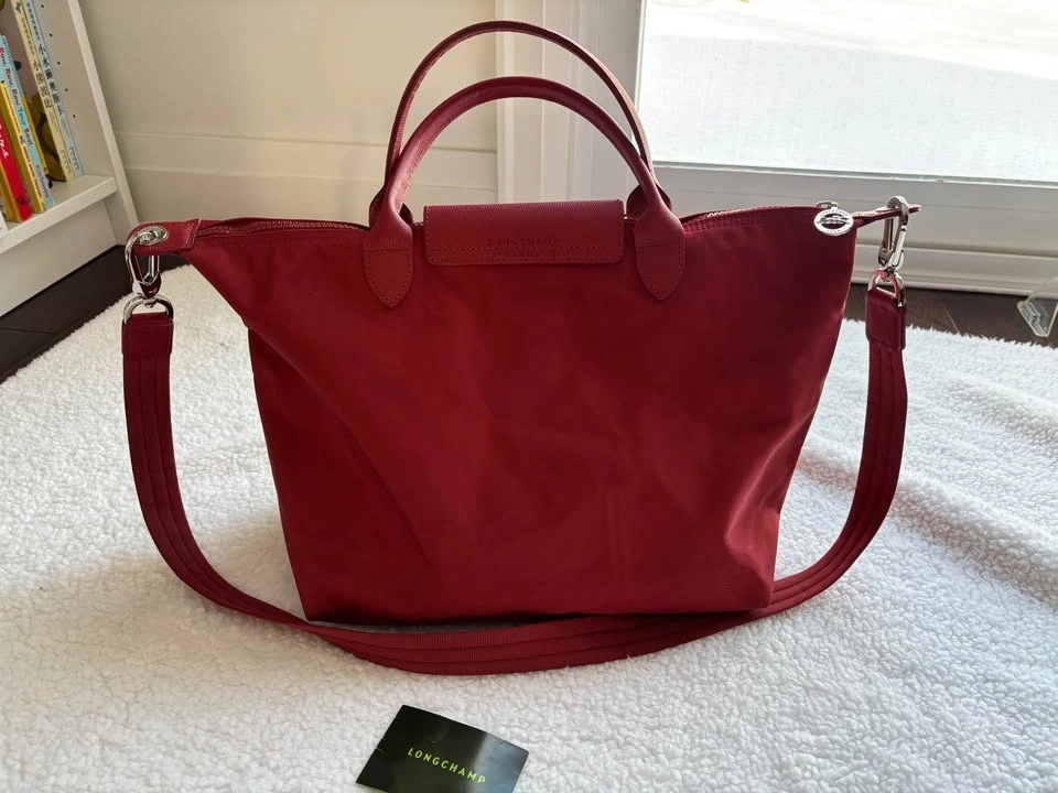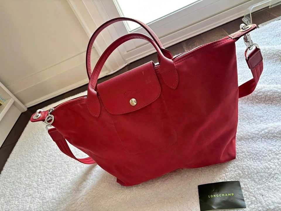 Longchamp Le Pliage Neo Medium tote bag in red with leather trim and a removable shoulder strap. Preferably pick up near 16th and 9th line.