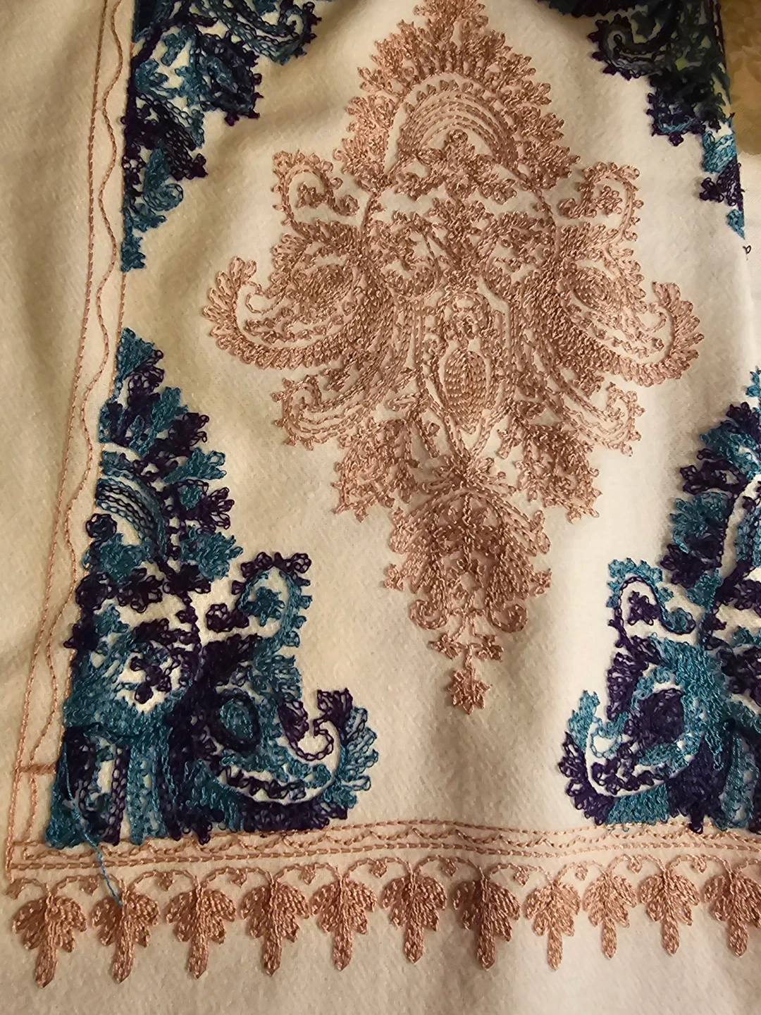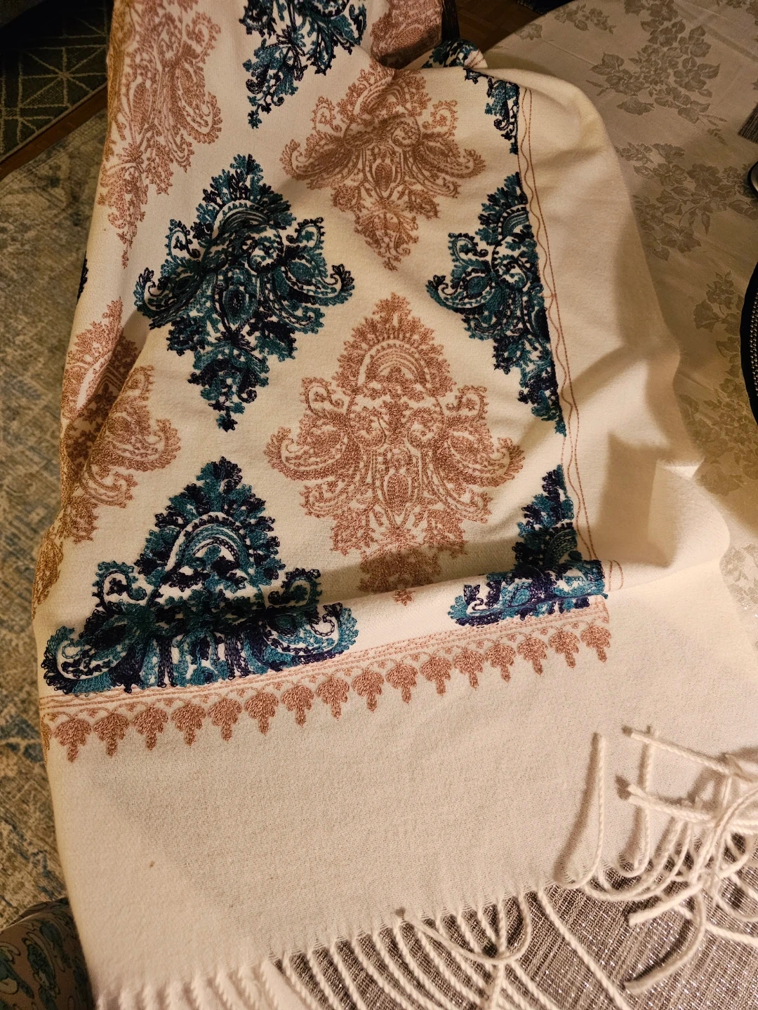 A cream-coloured shawl/scarf featuring intricate embroidery. It's decorated with rose gold and teal damask-style patterns. It's really big and beautiful! A real showstopper