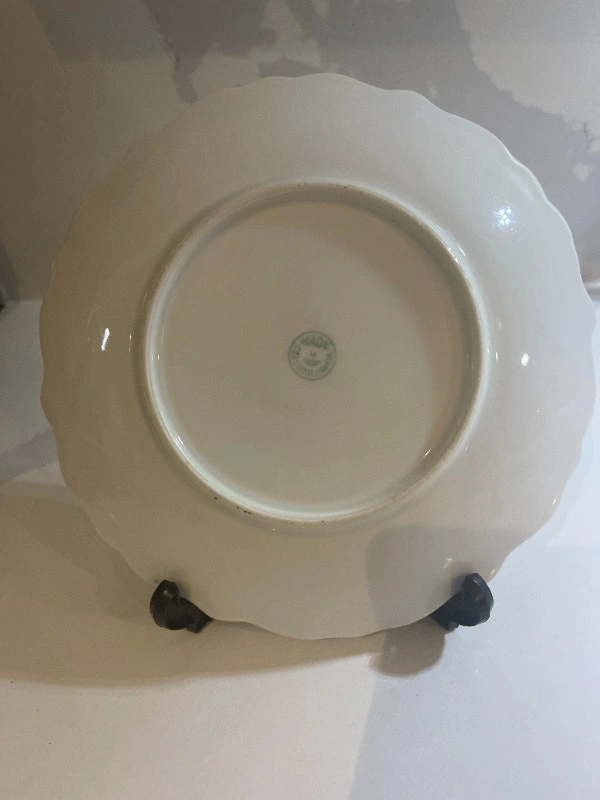 This pretty plate has a rococo style pattern and is embellished with gold trim. Hand-painted purple and pink flowers are on the plate. Measures: 7 ½ " in diameter. Condition: Used - Like new. For Sale By: Owner. Curbside pick up: Yes. Cash accepted: Yes.