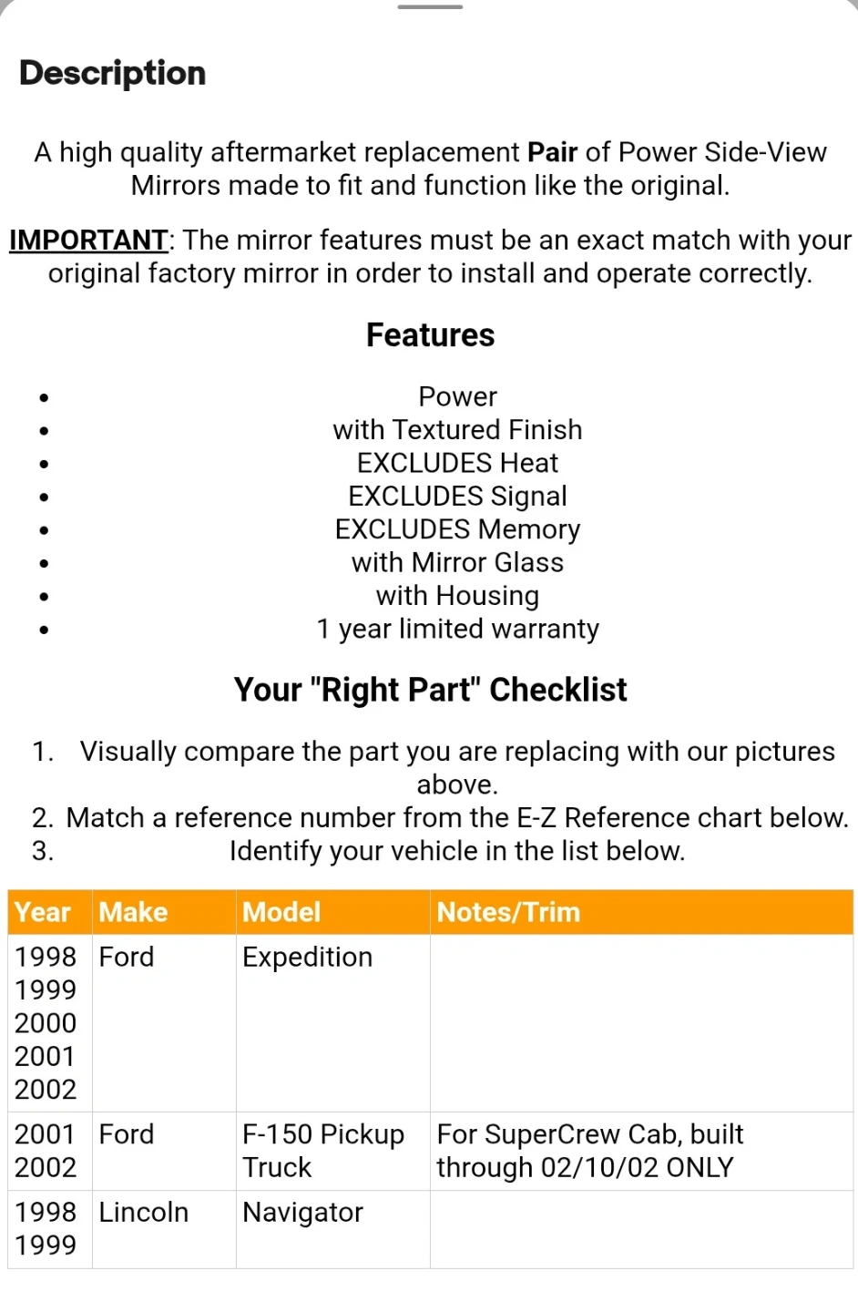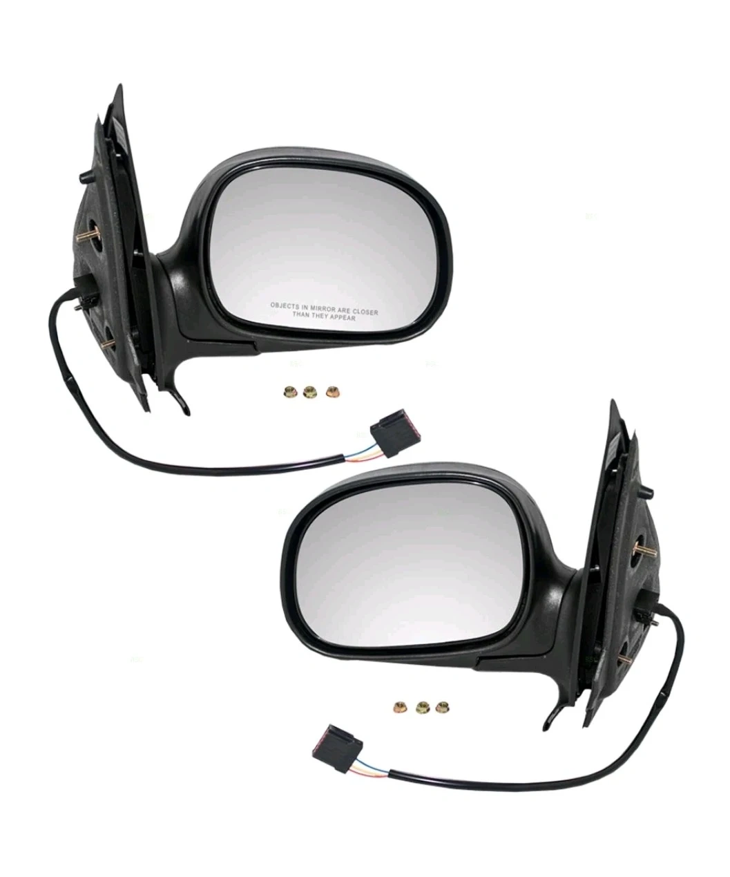 These are aftermarket replacement power side-view mirrors with a textured finish. They are designed to fit and function like original equipment. This pair includes mirror glass with housing.