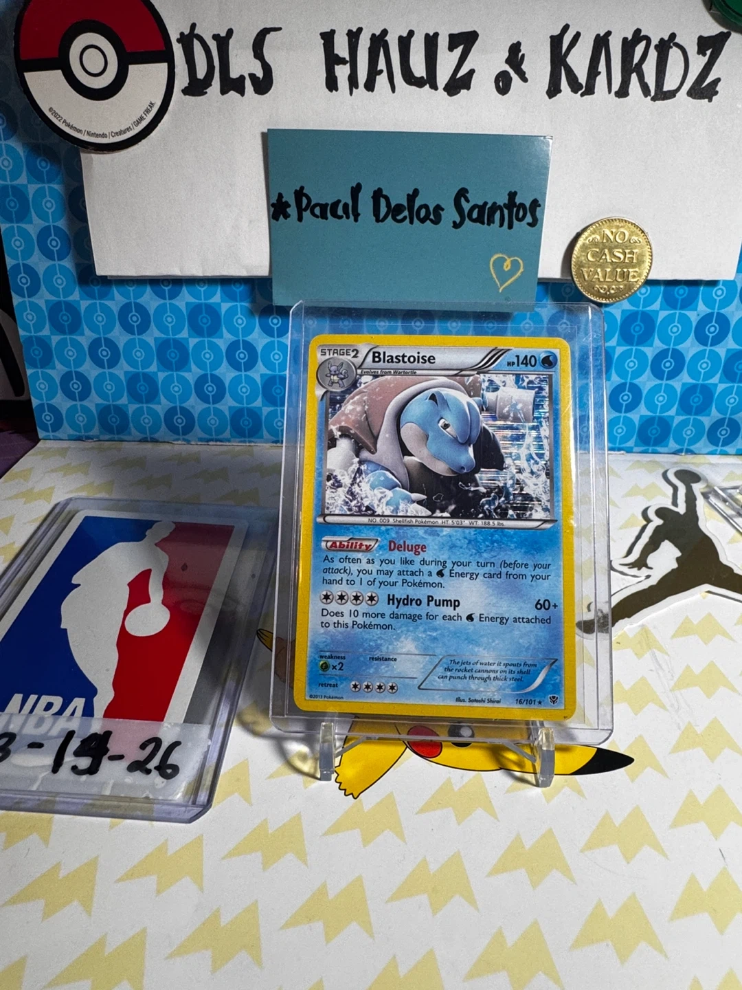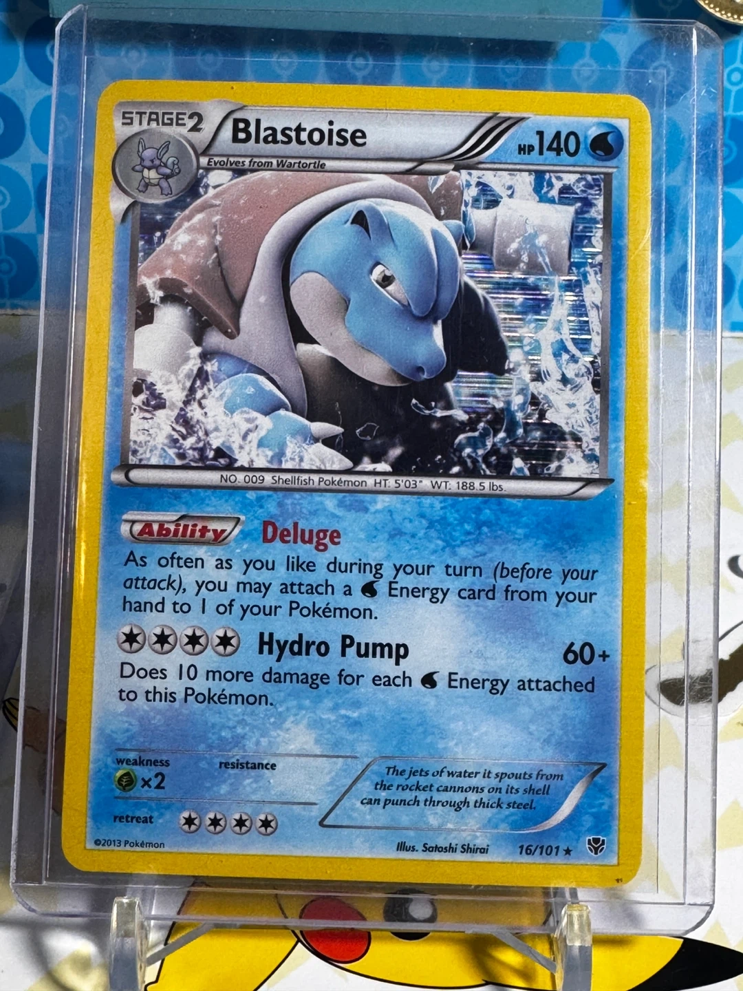 This is a Stage 2 Blastoise Holo trading card from Pokémon. It features the 'Deluge' ability and a 'Hydro Pump' attack. The card is in a protective sleeve.